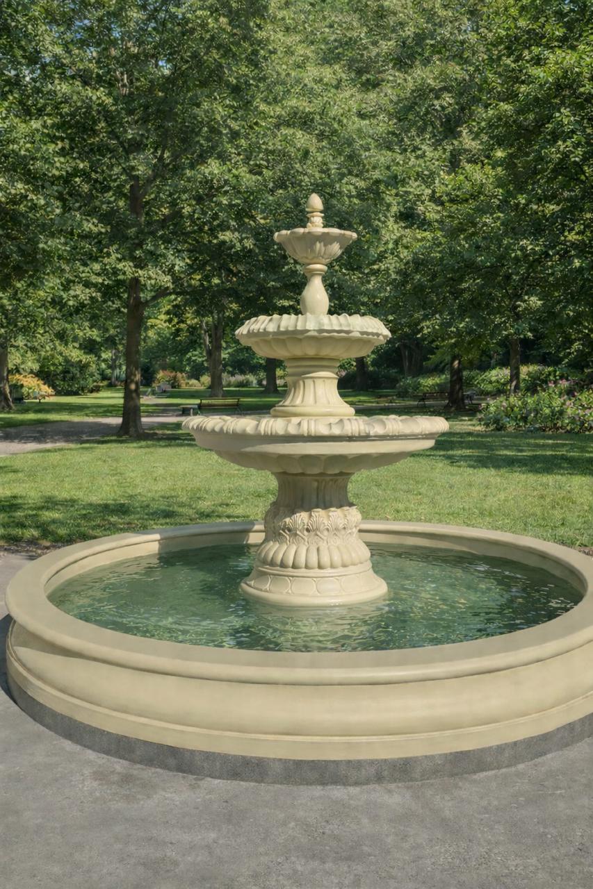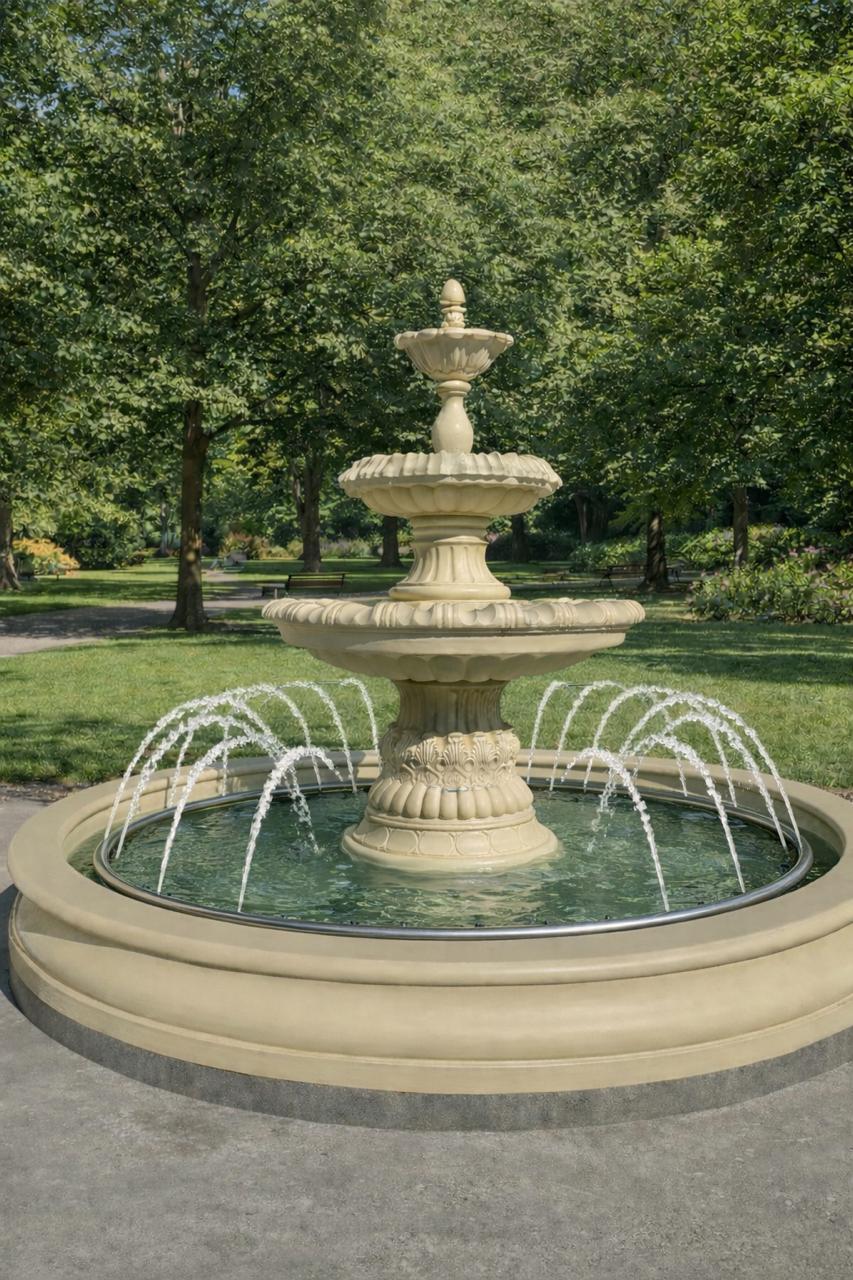 Фонтан «Дворцовый» выполнен из прочного архитектурного бетона, устойчивого к перепадам температур, влаге и ультрафиолету, что делает его идеальным решением для круглогодичной эксплуатации на открытом воздухе. Классическая многоярусная форма создаёт выразительную водную композицию и эффектный визуальный акцент в пространстве.