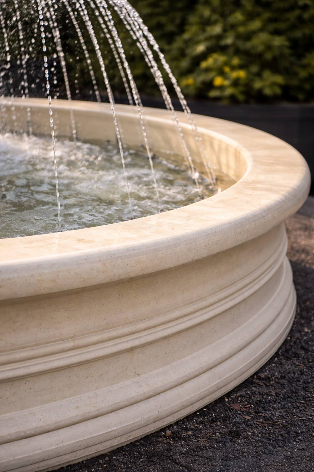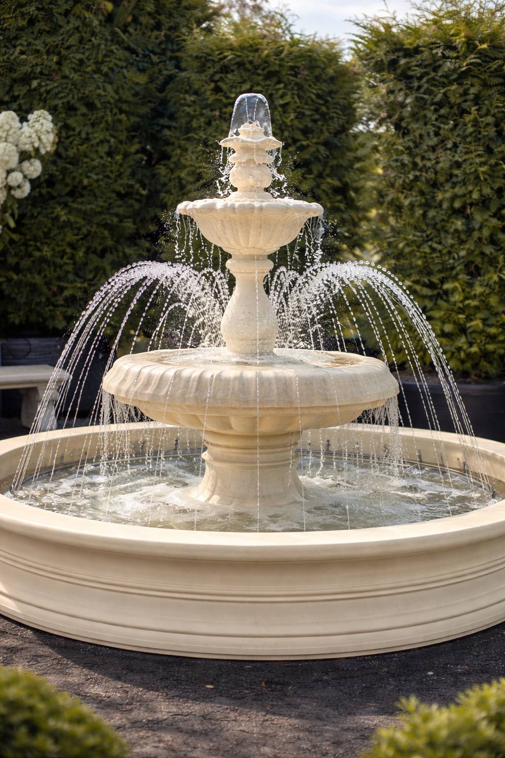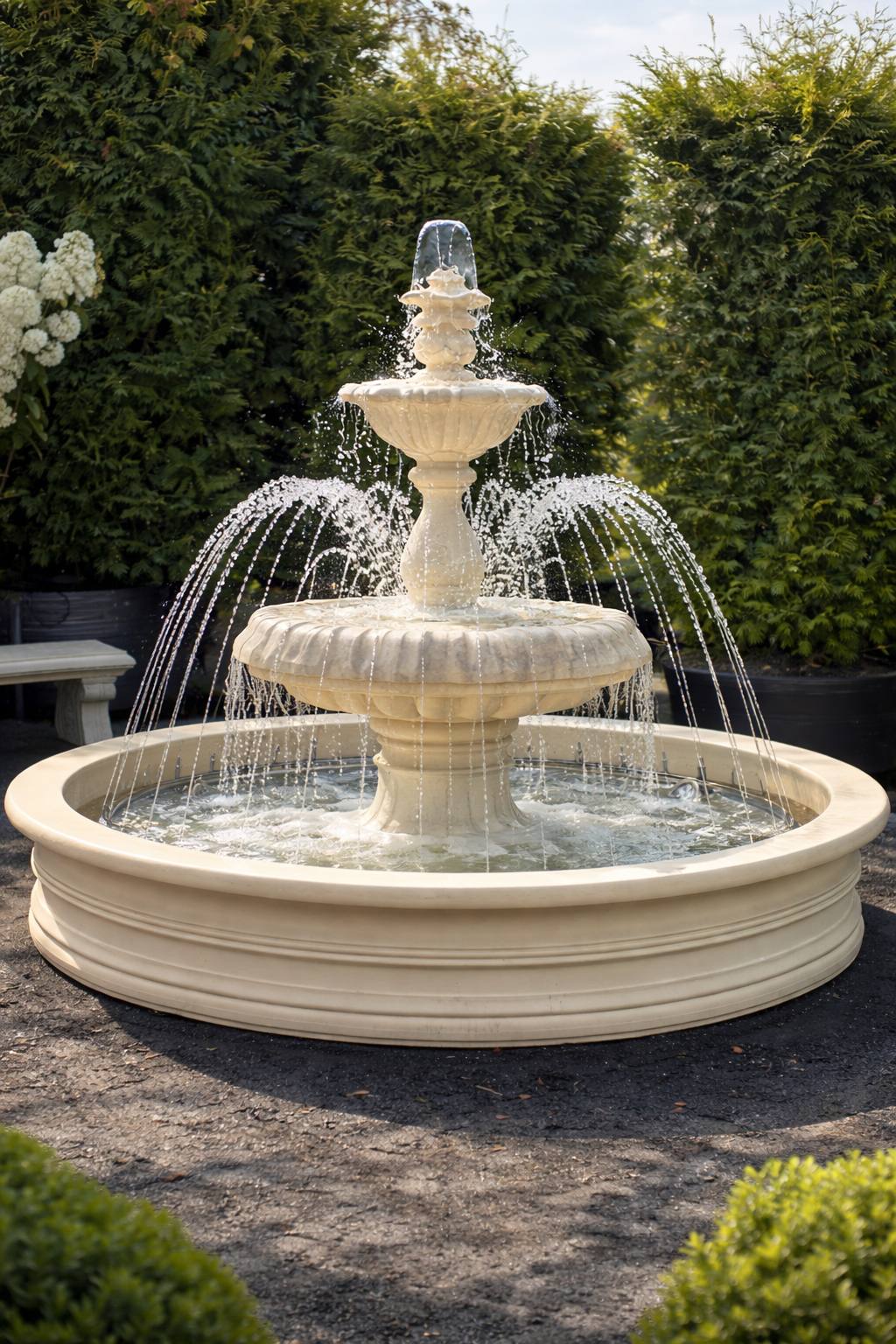 Фонтан имеет цельный бассейн диаметром 236 см, что обеспечивает визуальную монолитность и повышенную эксплуатационную надёжность. Отсутствие сборных швов улучшает герметичность конструкции и положительно влияет на срок службы при постоянной нагрузке водой. Большой диаметр чаши позволяет использовать фонтан как главный архитектурный элемент сада или парадной зоны.