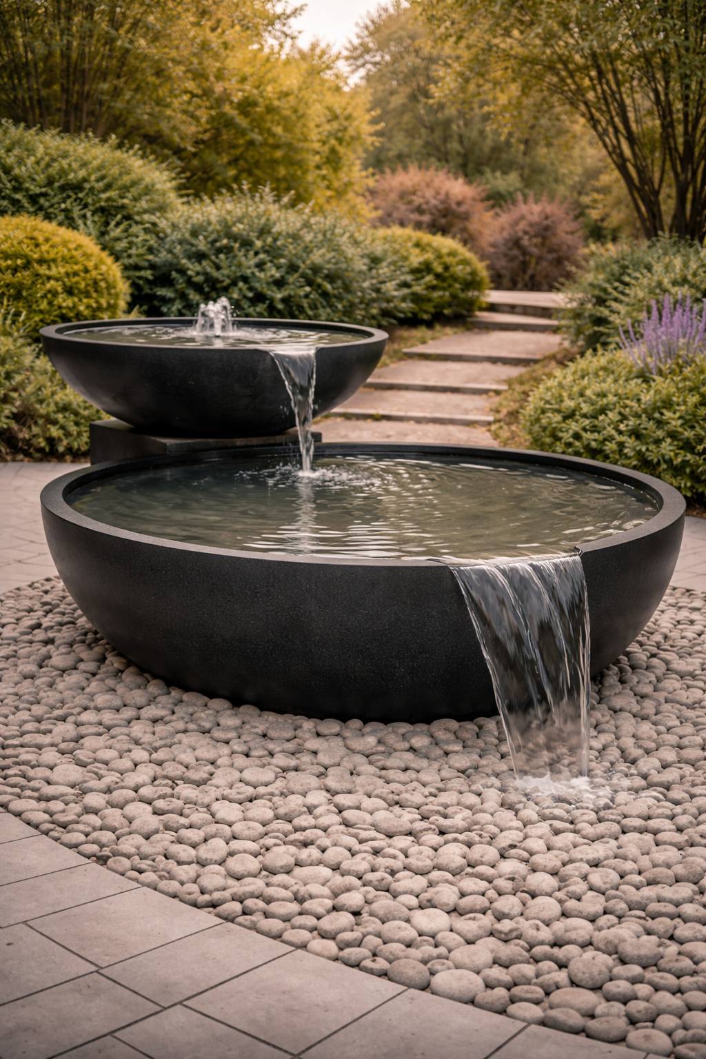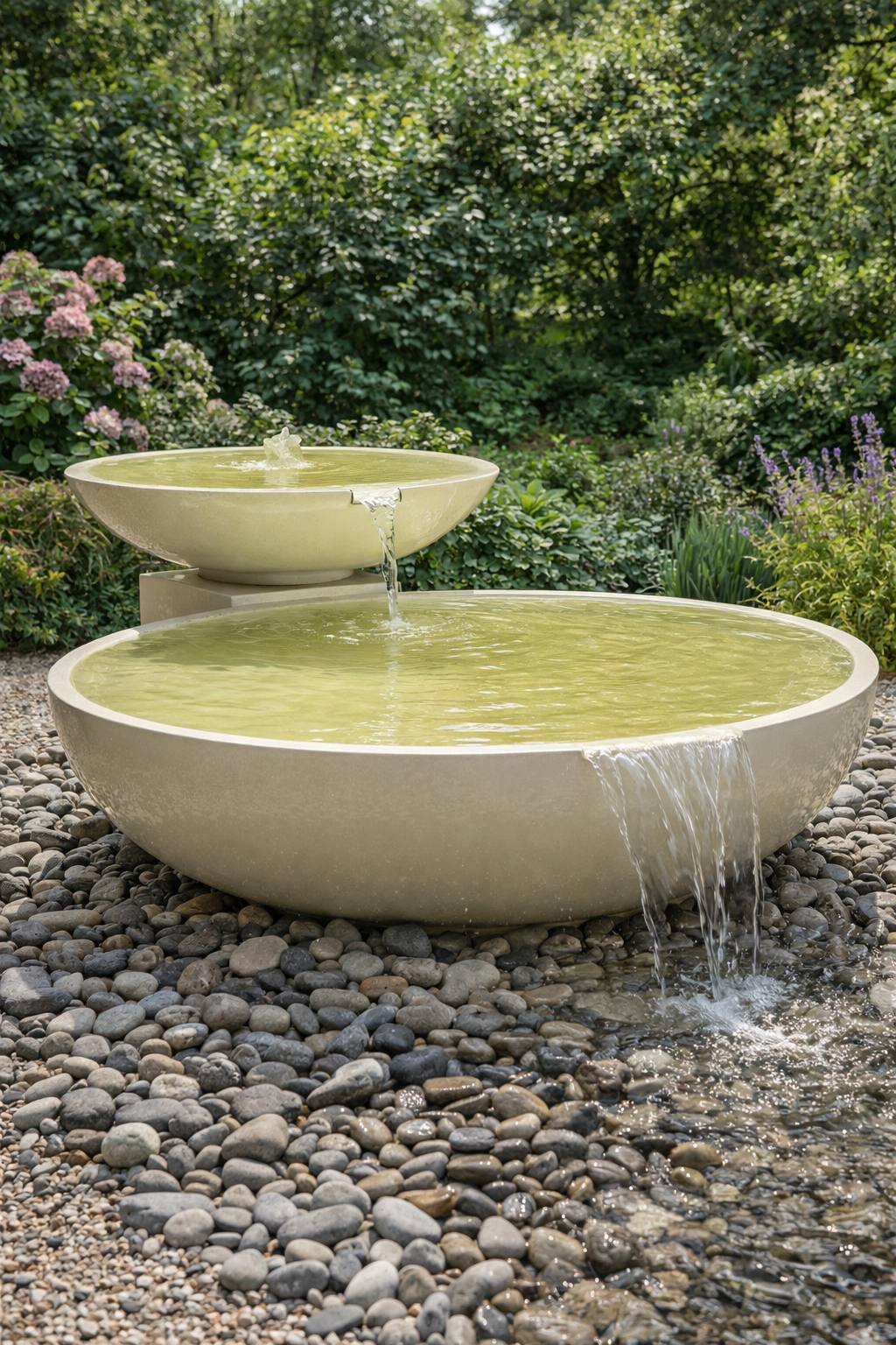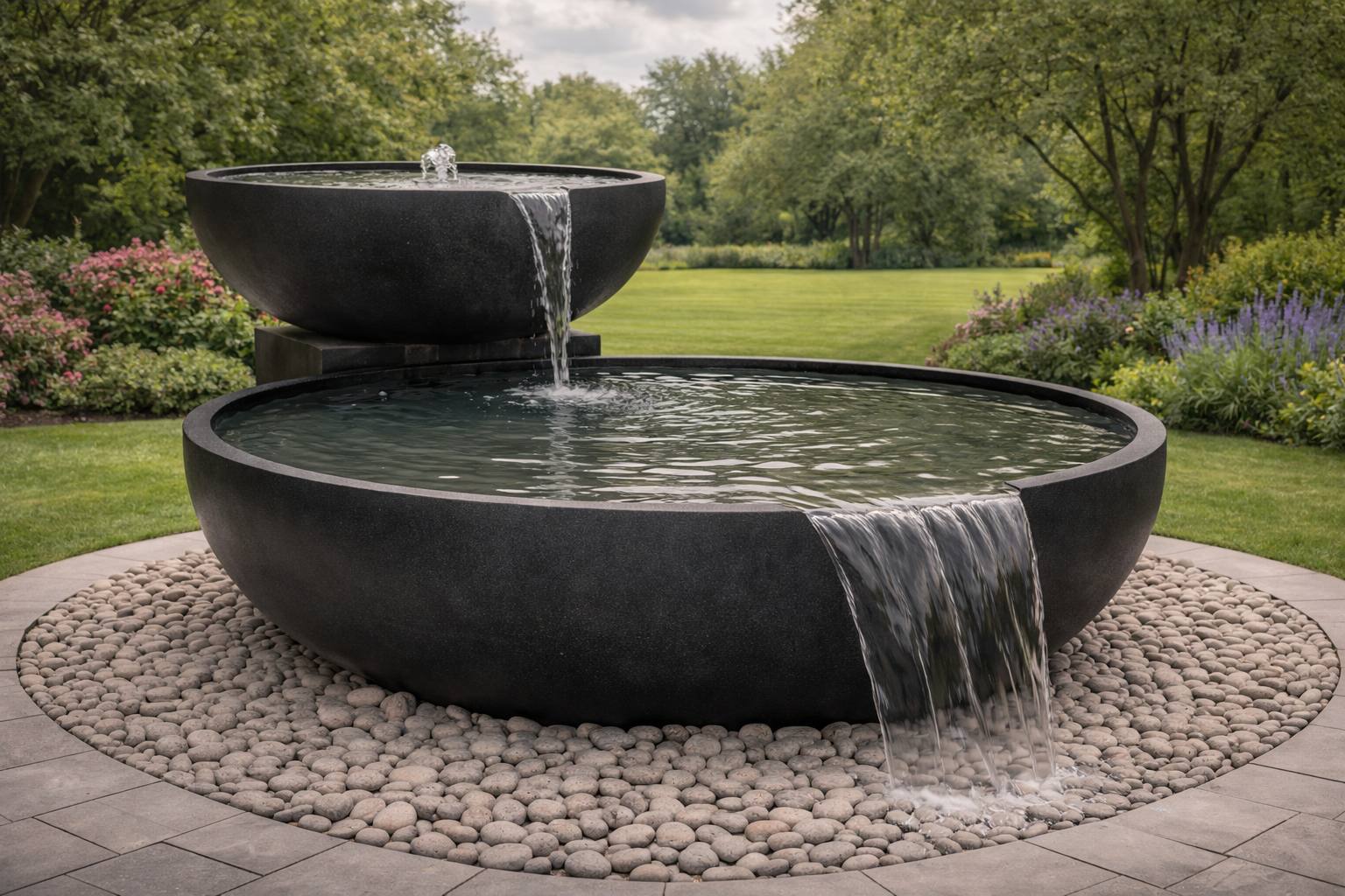 Композиция из двух чаш, выстроенных по принципу каскада, формирует чистую геометрию и выразительный водный ритм. Перелив воды создаёт мягкий акустический фон и визуальную динамику, усиливая ощущение комфорта и приватности.