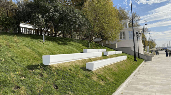 Белая скамья из архитектурного бетона, украшенная иониками, волютами, пальметтами и другими классическими орнаментами. Благодаря такому декору, лавка подходит для садов в античном и классическом стилях. Также она станет органичным элементом парка или придомовой территории, сочетающей эстетику разных эпох.