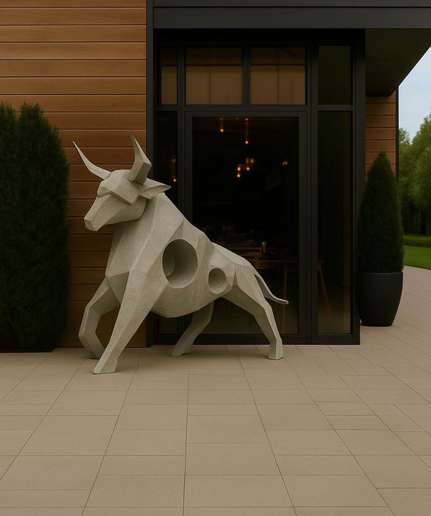 Скульптура «Бык» органично вписывается в самые разные архитектурные концепции: от строгого минимализма до современных премиальных решений с использованием дерева, стекла, металла и природного камня. Композитная фактура делает её универсальной: она отлично смотрится на террасах, в садовых зонах, у панорамных фасадов, рядом с входными группами и в коммерческих пространствах.