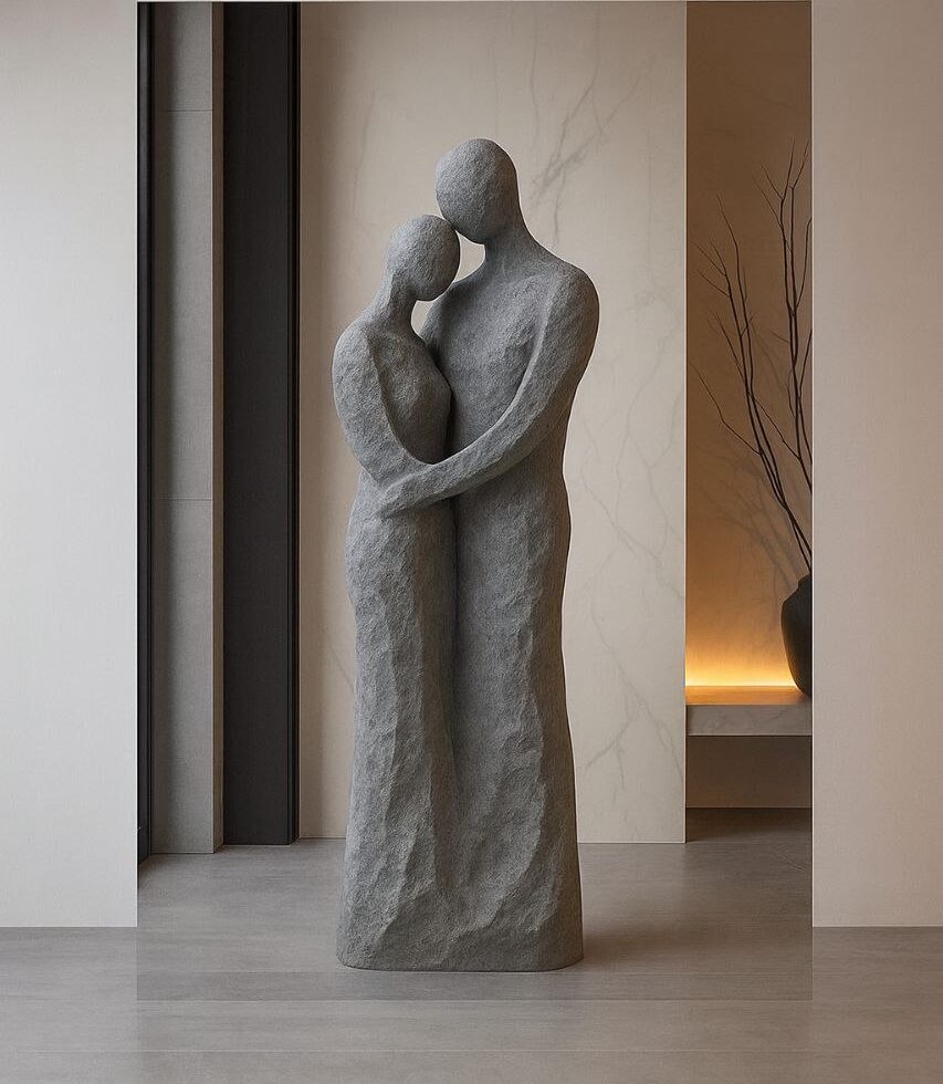 Выразительная текстура камня эффектно контрастирует с минималистичным дизайном интерьера, подчёркивая эстетику современного искусства. Мягкое естественное освещение раскрывает объём и линии скульптурной композиции, создавая атмосферу гармонии и спокойствия. Это стильный арт-акцент и глубокий символ человеческой близости, который не требует слов.