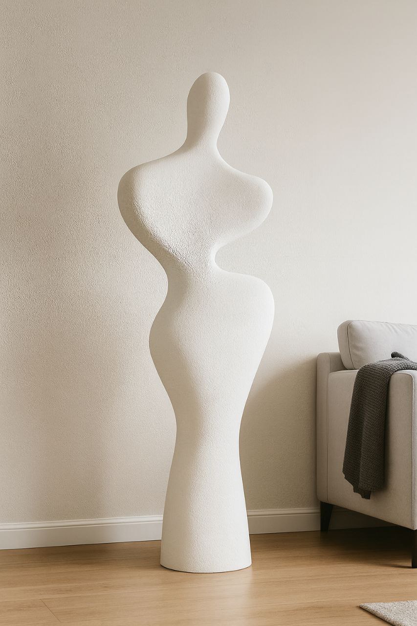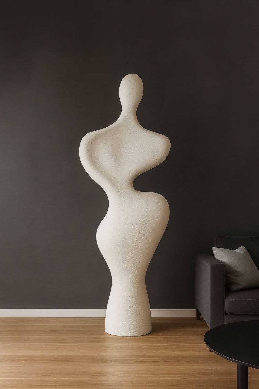 Силуэт скульптуры построен на мягких асимметричных изгибах, напоминающих естественный ритм движения. Форма лишена лица и прямой фигуративности, но остаётся динамически антропоморфной — она читается как образ, но не навязывает конкретной истории. Благодаря этому арт-объект становится универсальным элементом композиции пространства: он взаимодействует с интерьером, но не конкурирует с ним. Плавные линии визуально смягчают архитектуру помещения и создают ощущение живого импульса, направляющего взгляд. Объект словно вырастает из пола, поднимается вертикалью, расширяется в плечевой зоне плавным контуром, затем снова сужается, уводя форму к устойчивому основанию. Этот баланс между расширением и сжатием создаёт чувство гармонии и управляемой кинетики — ключевое качество для интерьерного декора в премиум-проектах.