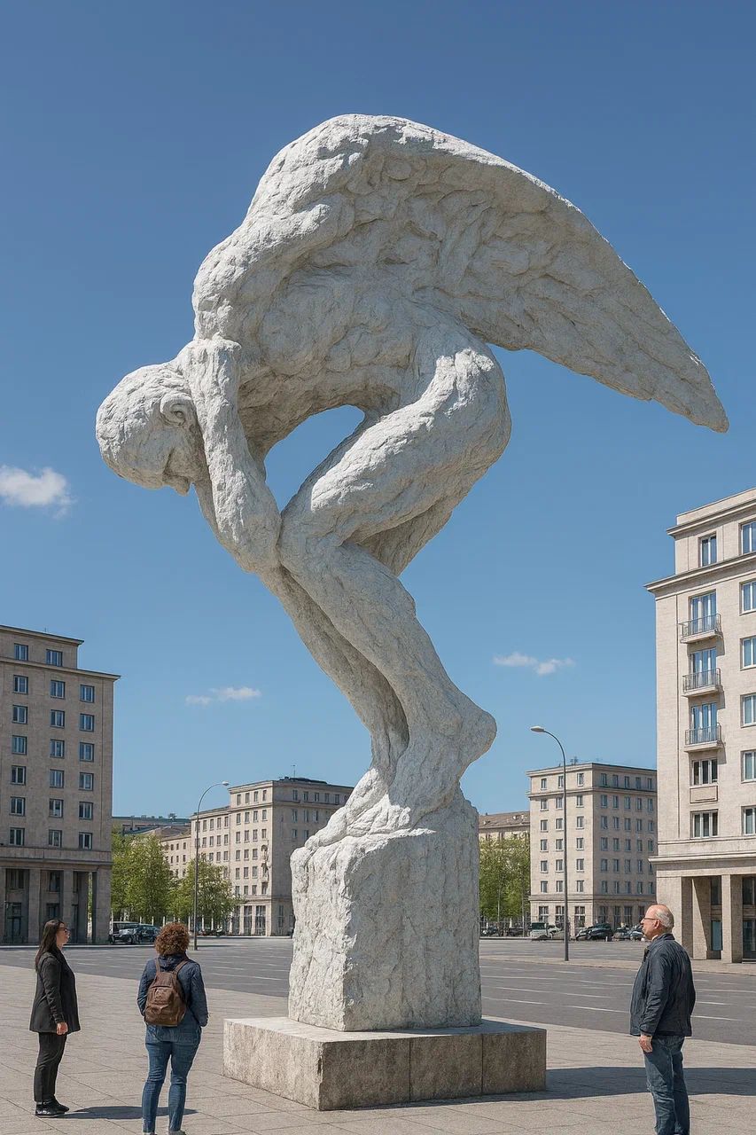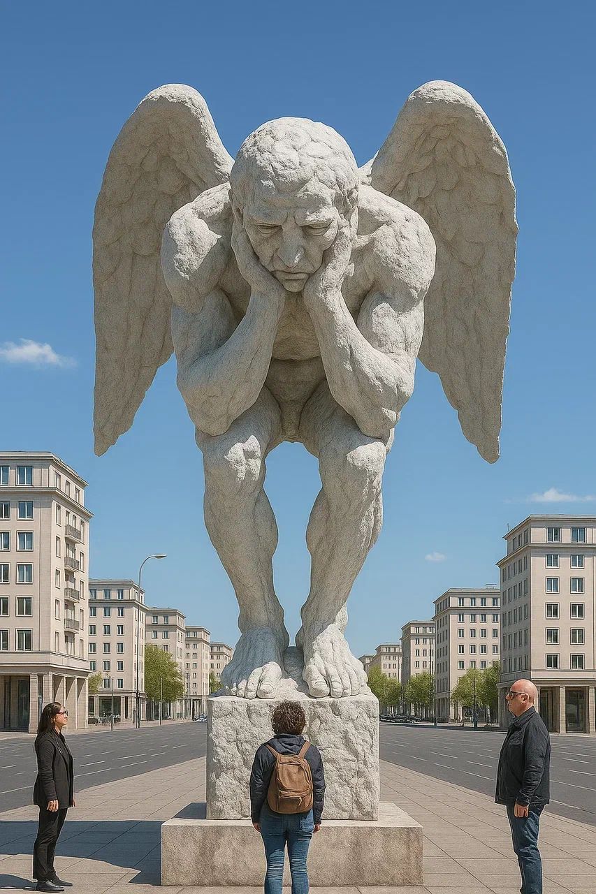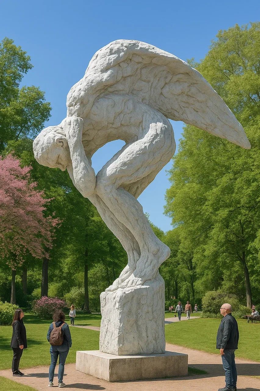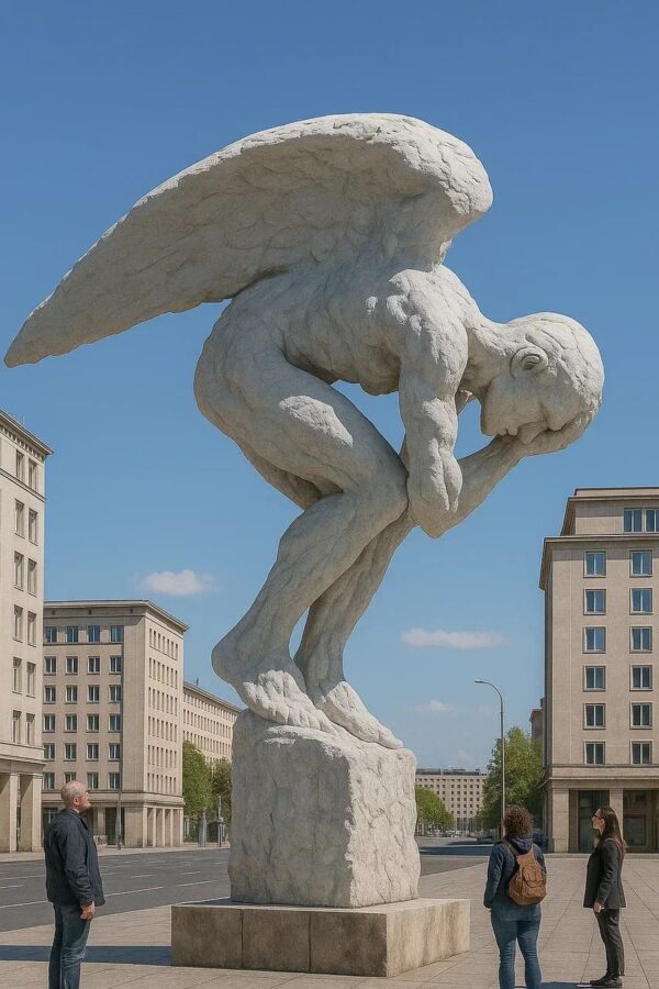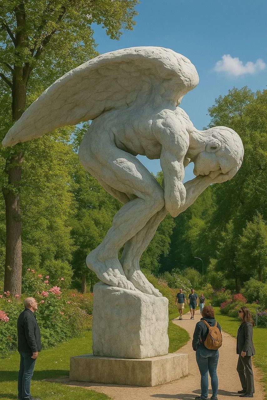 Созданная с невероятным мастерством, эта скульптура поражает своей динамикой и реализмом. Каждый мускул, каждая складка ткани, каждая прожилка на крыльях — всё дышит жизнью, несмотря на холодный камень. Фигура ангела, склонившегося под тяжестью невидимого бремени, вызывает одновременно сочувствие и восхищение. Его поза — это не слабость, а сосредоточенная сила, готовность принять вызов, несмотря на кажущуюся уязвимость.