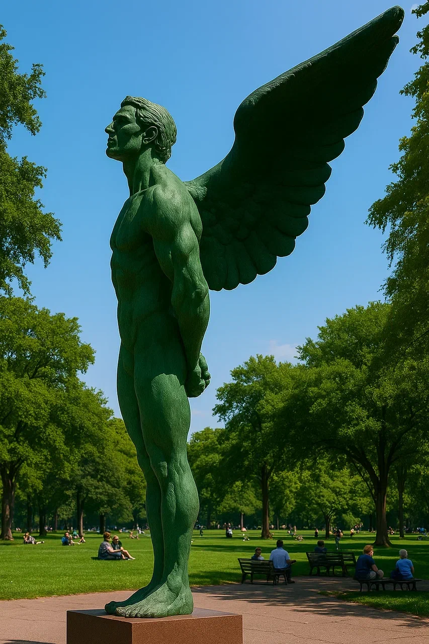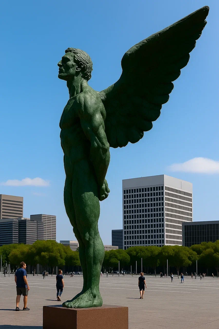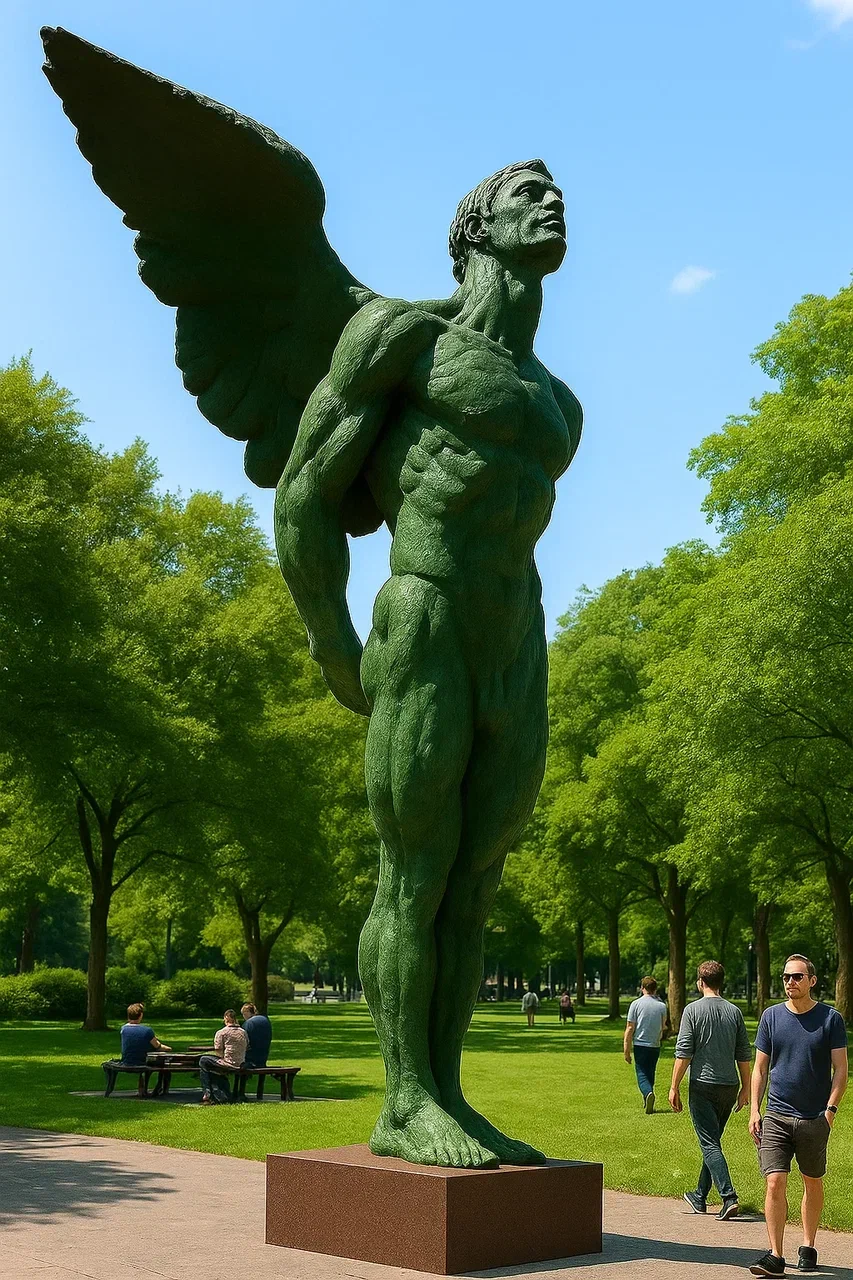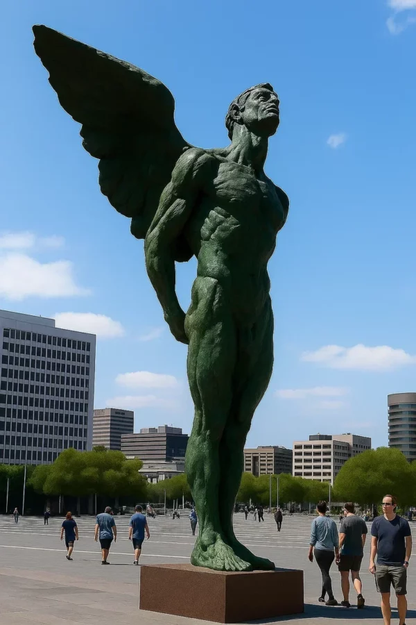 Мощная мускулатура фигуры подчеркивает внутреннюю силу, стойкость и готовность к преодолению любых преград. Каждый изгиб тела, каждая деталь крыльев передают ощущение энергии и динамики, приглашая зрителя к размышлению о собственных возможностях и целях.