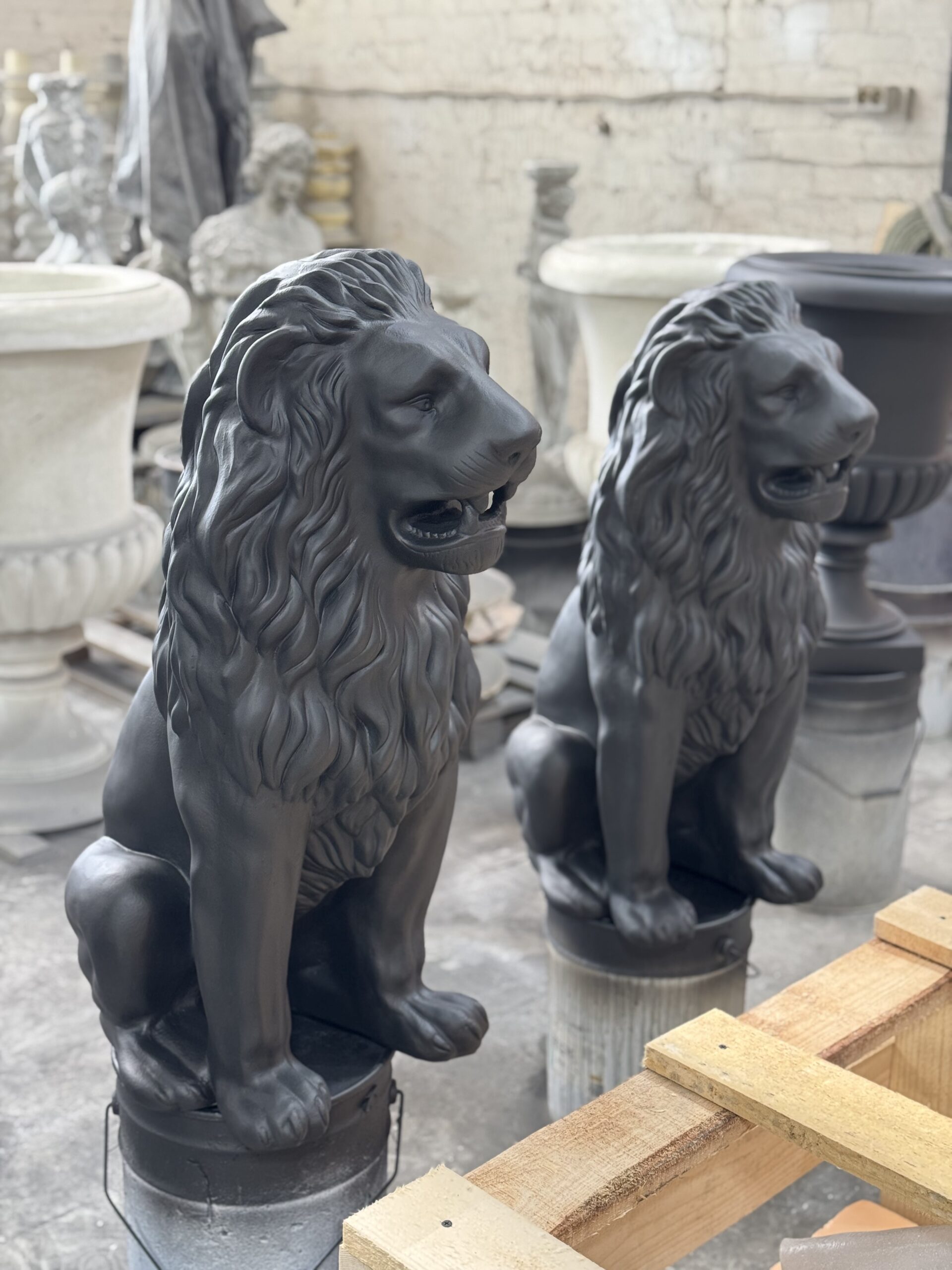 Залог идеально гладкой поверхности наших скульптур заключается в многоэтапной технологии декоративной отделки. После отливки статуи тщательно шлифуются и покрываются качественной шпатлевкой. Обеспечив скульптурам безупречно гладкую поверхность, мы грунтуем изделие, и только после этого наносим слой черной фасадной краски. Благодаря отработанным технологиям и использованию проверенных материалов наши львы сохраняют цвет на протяжении долгих лет.