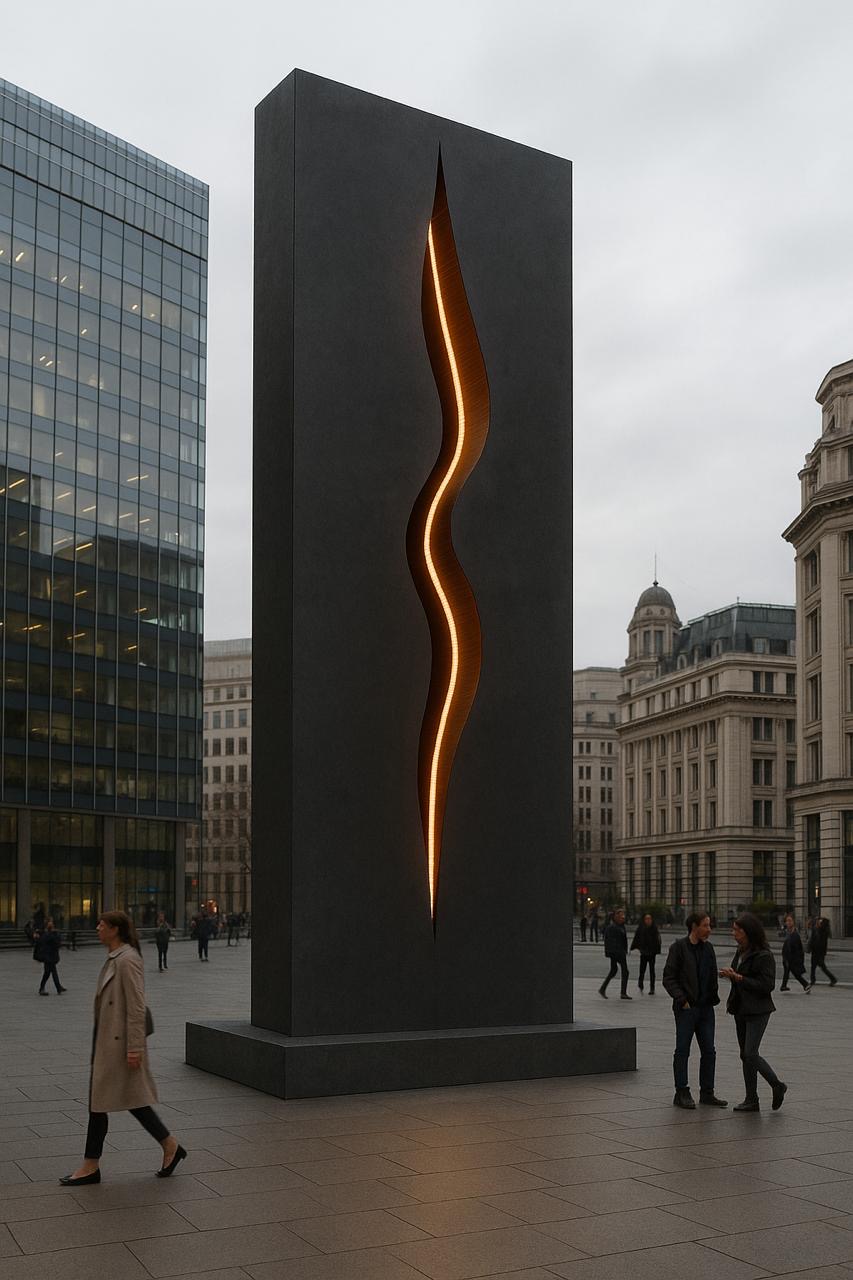 Скульптура представляет собой вертикальную стелу, рассеченную продольным, волнообразным разрезом. Этот разрез, словно живое пламя, освещен изнутри теплым, пульсирующим светом. Форма выреза не случайна – она повторяет изгибы человеческого тела в движении, символизируя динамику, страсть и стремление к развитию.