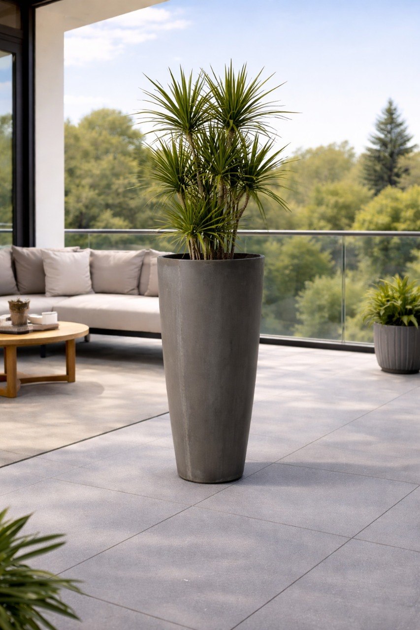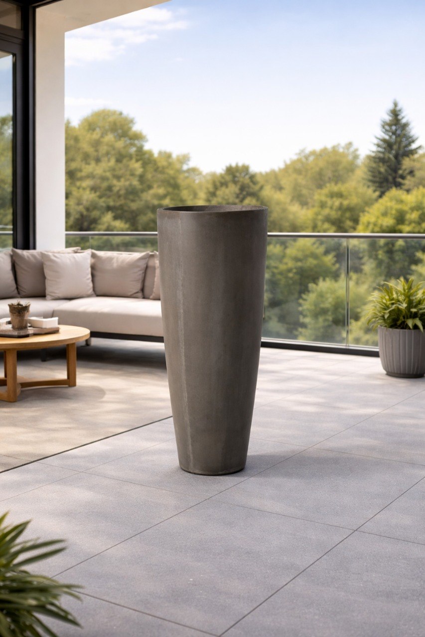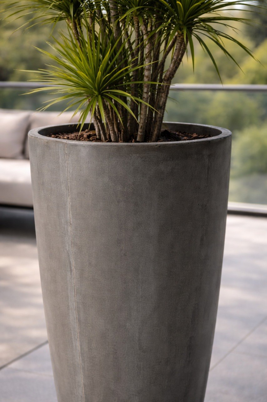Вазон изготовлен из архитектурного бетона с улучшенными эксплуатационными характеристиками, достигнутыми за счет добавления специальных присадок и пластификаторов. Технология отливки на вибростоле обеспечивает равномерную усадку бетона без пустот и пористости, что сказывается на безупречной фактуре изделия и его прочности.