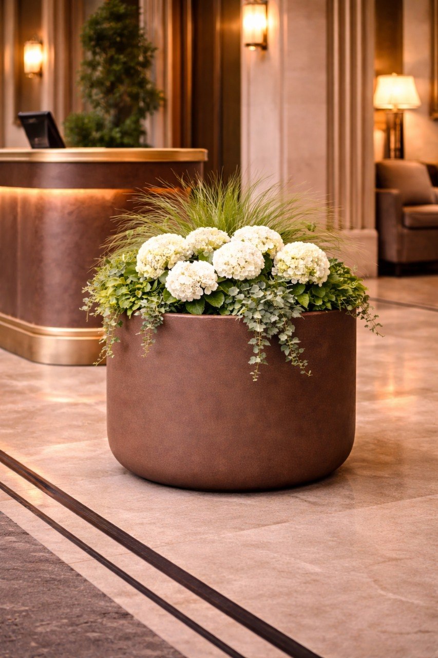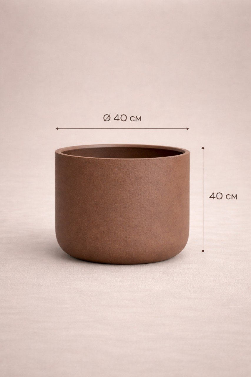 Благодаря продуманным пропорциям (диаметр 40 см, высота 40 см), кашпо отлично подходит для средних и крупных растений, включая декоративные композиции с ниспадающей зеленью или цветами.