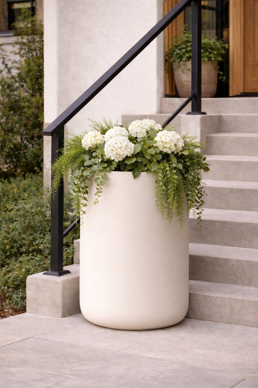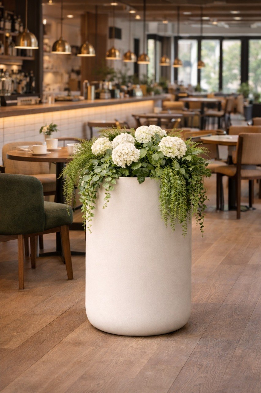 Минималистичная цилиндрическая форма делает кашпо универсальным: оно легко интегрируется как в классические, так и в современные интерьеры. Светлый, молочный оттенок визуально облегчает конструкцию и подчеркивает зелень растений, создавая эффект «дорогого» оформления пространства.