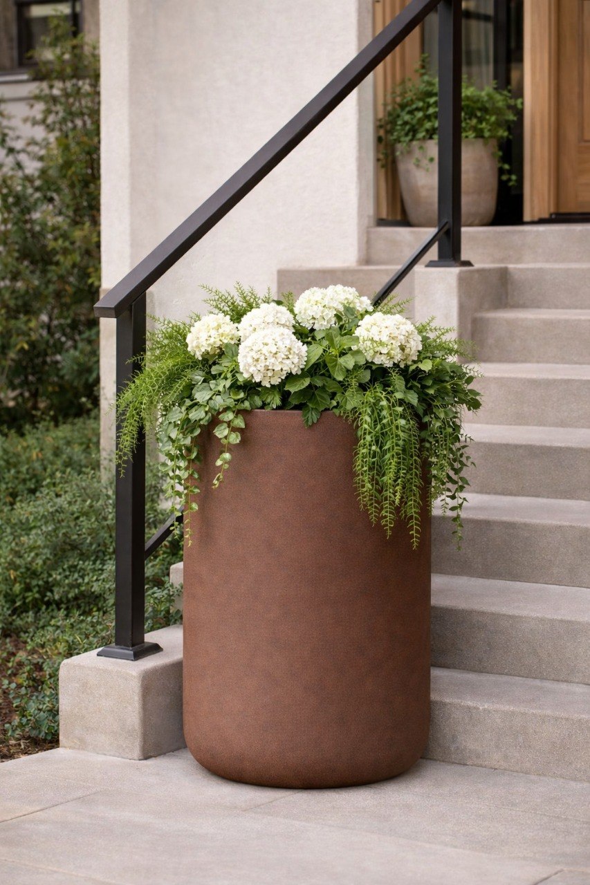 Материал не боится влаги и температурных перепадов, что позволяет использовать изделие как внутри помещений, так и на улице. При этом кашпо легче бетонных аналогов, что упрощает транспортировку и установку.