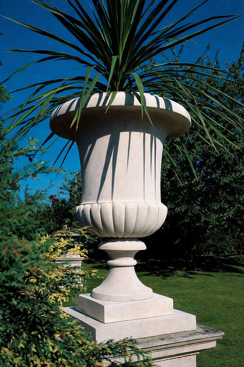 Такой вазон органично смотрится в частных усадьбах и на загородных участках — у входных групп, вдоль дорожек, на террасах или в парадных зонах сада. Он также подходит для оформления ресторанов, где важно создать атмосферу продуманного и цельного пространства, а также для парков и скверов, где требуется долговечный и визуально выразительный элемент благоустройства. Благодаря своей форме изделие может использоваться как самостоятельный акцент или как часть симметричных композиций.