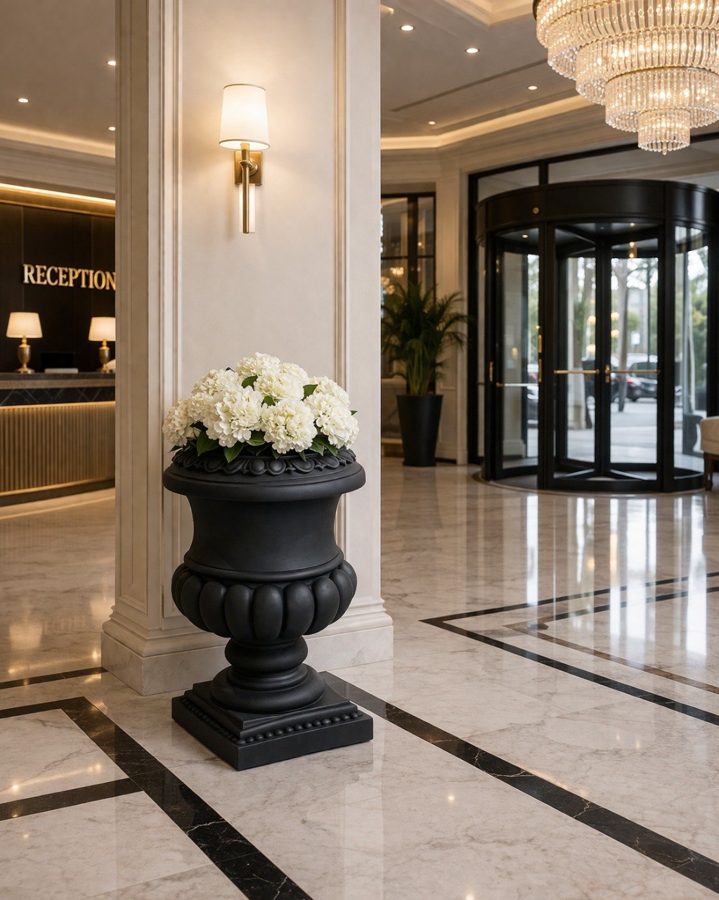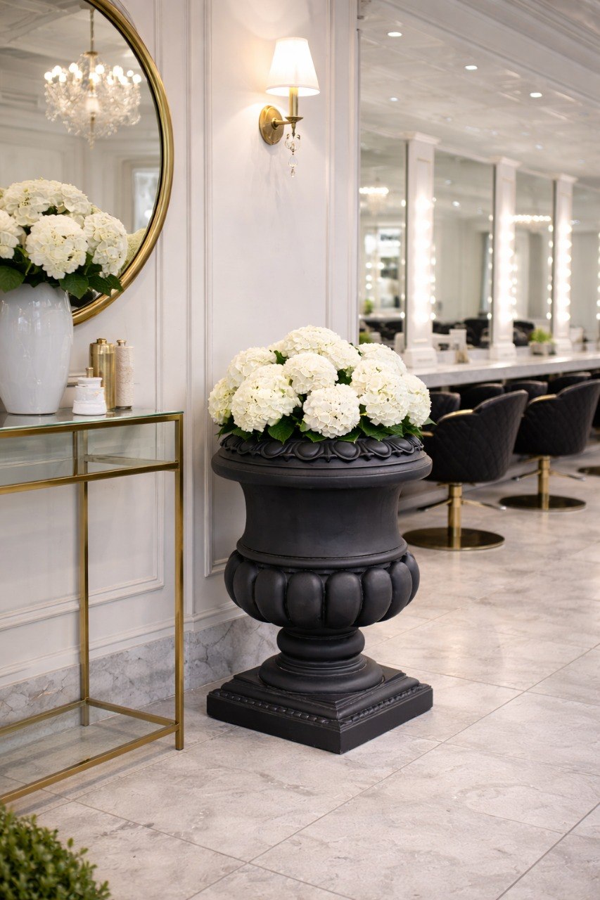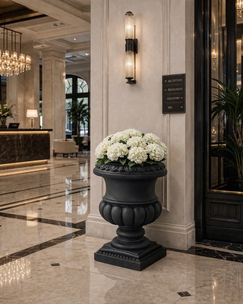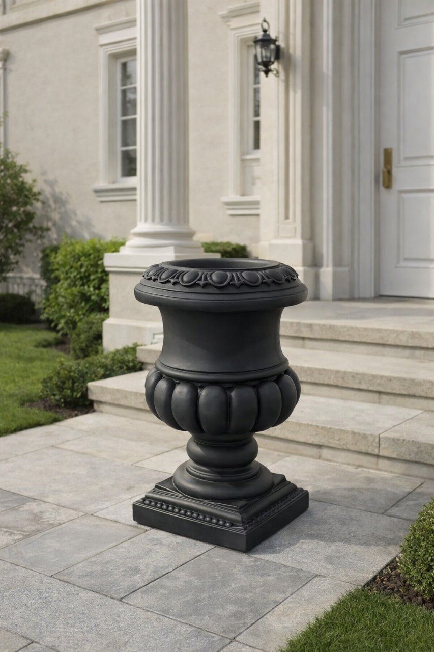 Вазон является классической архитектурной формой. Его используют в самых разных ландшафтных проектах для зонирования и расстановки акцентов. Черный античный вазон органично взаимодействует с архитектурой. Монументальными цветниками обрамляют парадные въезды и вход в здания, украшают балконные балюстрады и террасы. Не менее выразительно такие архитектурные формы смотрятся в просторных классических интерьерах.