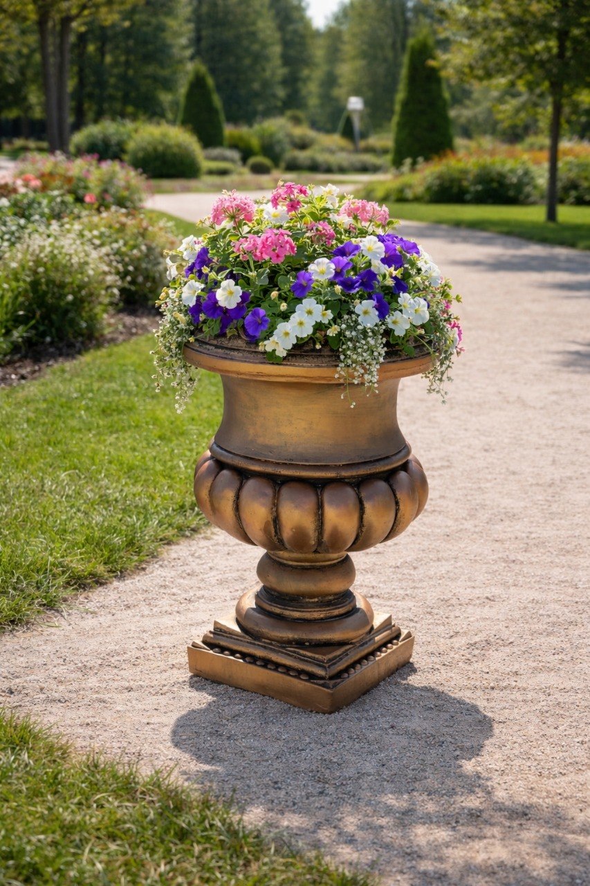 Вазон высокая «Римская чаша» – оптимальный декор для любого сада. Изделие в стилизации под бронзу хорошо сочетается с зелеными насаждениями, всеми видами цветов и кустарниками. Он удачно дополняет эстетику любого ландшафтного проекта. Вазоны можно эффективно использовать для зонирования территории, расстановки акцентов, обрамления садовых дорожек и т. д. Не менее выразительно эти чаши взаимодействуют с классической архитектурой. Их используют для декорирования входной группы, украшения террас и балюстрад.