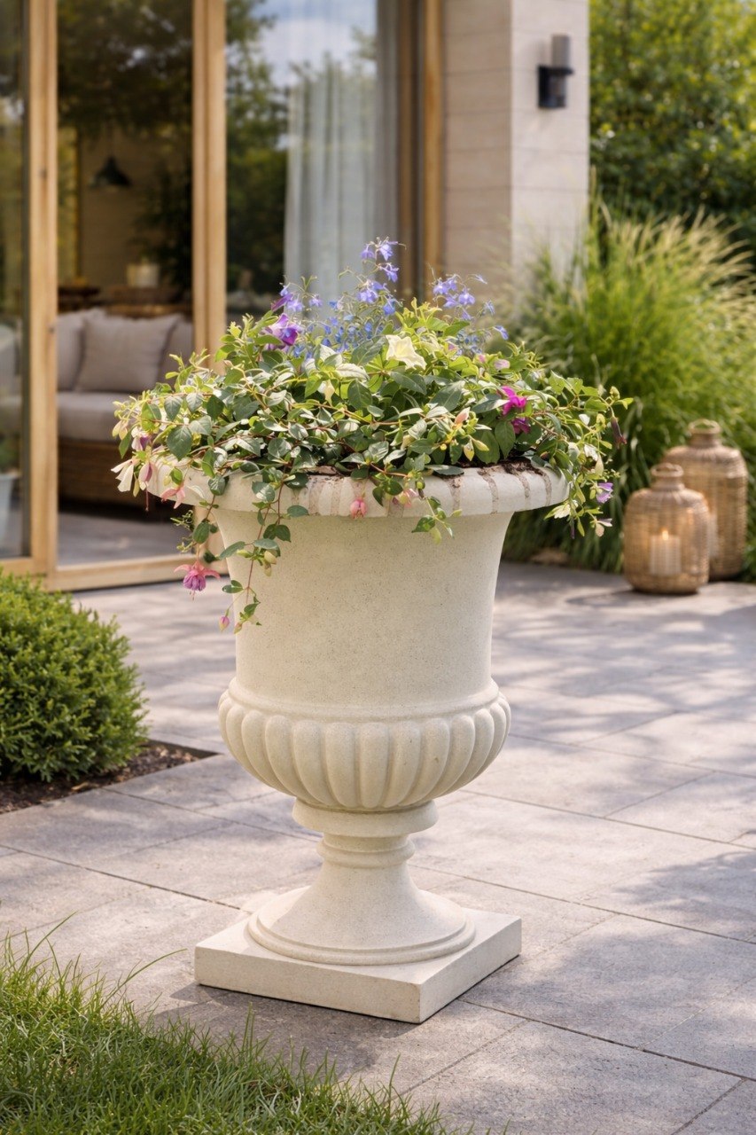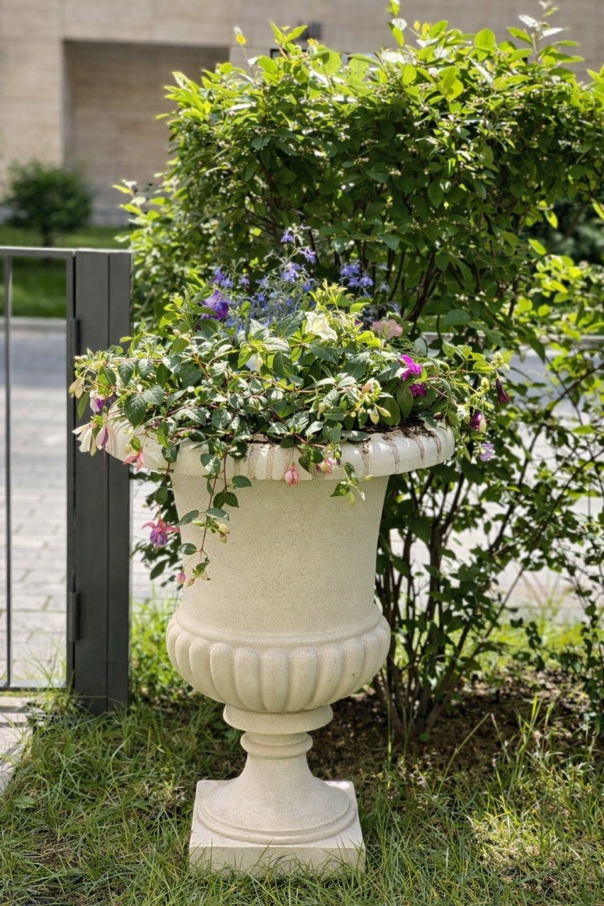 Классическая высокая ваза, установленная посреди зеленой клумбы, станет ключевым элементом ландшафтного дизайна и создаст гармоничную композицию при оформлении балконов, лестниц, аллей и садовых площадок.