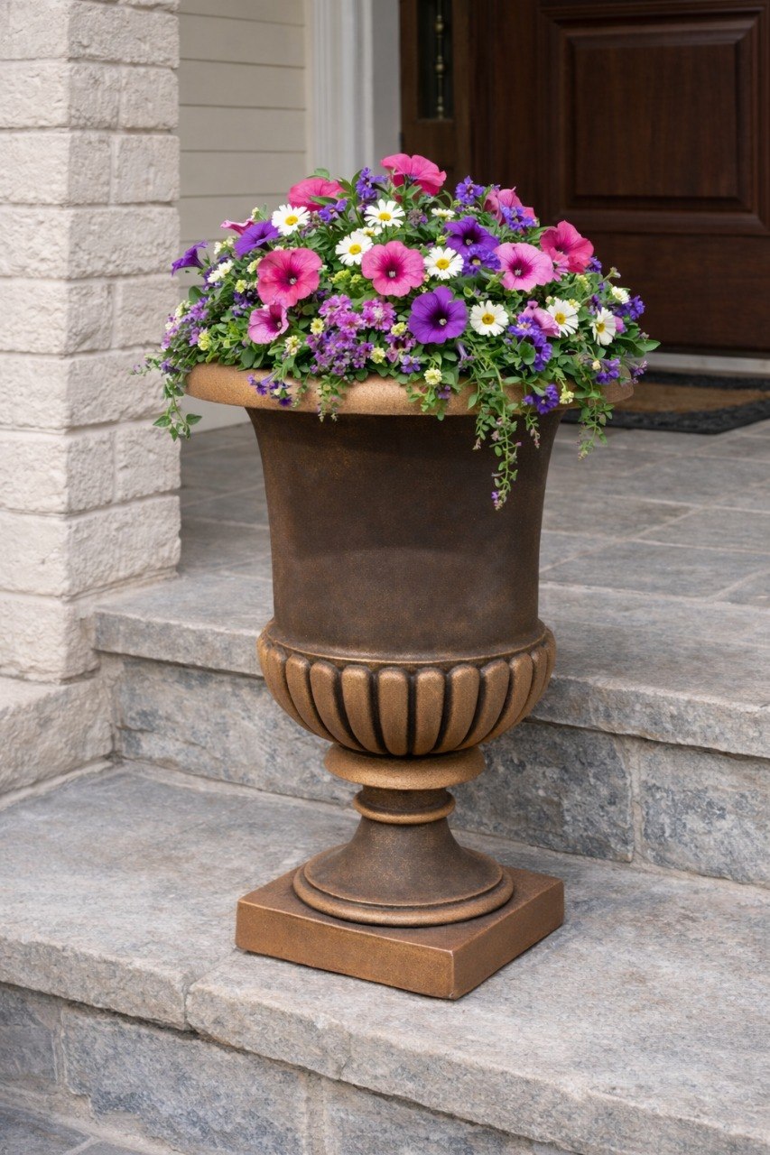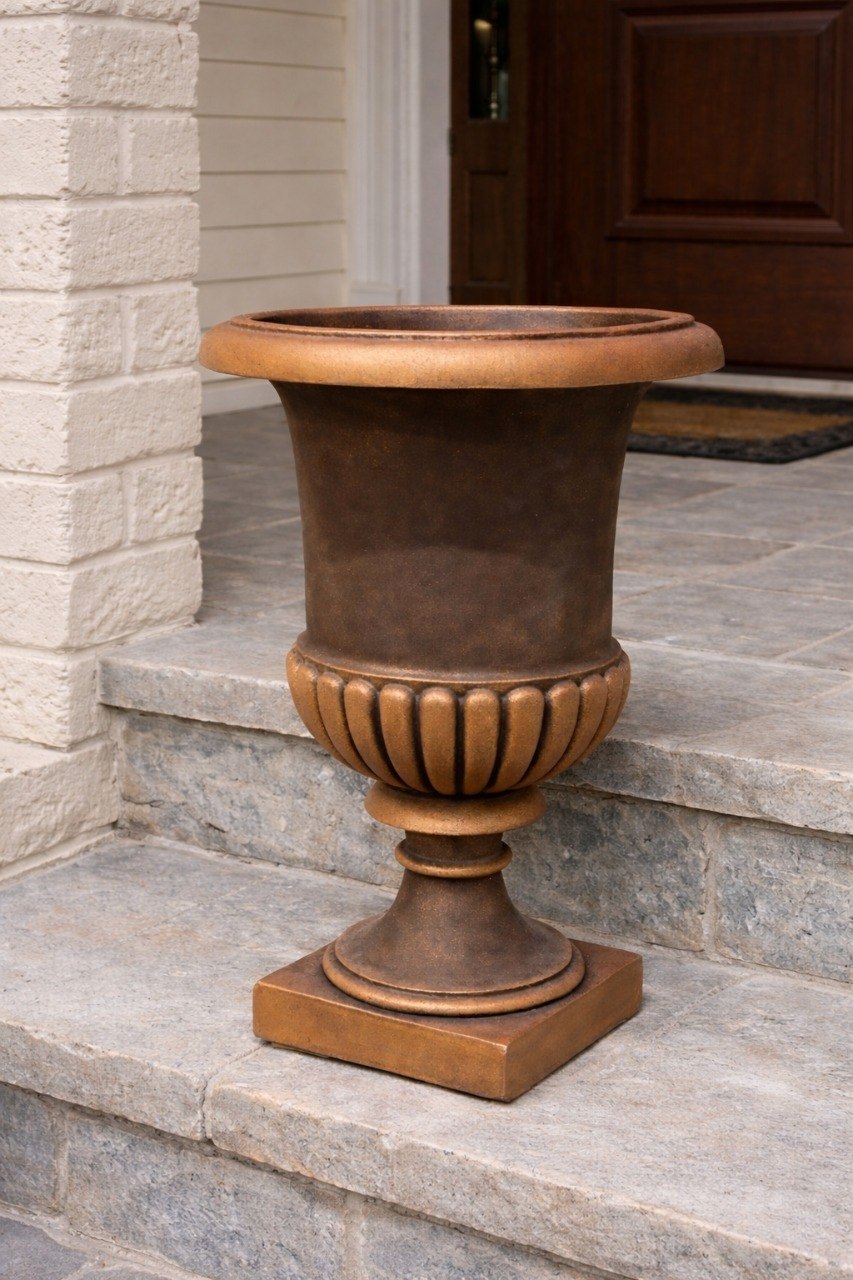 Классическая высокая ваза, установленная посреди зеленой клумбы, станет ключевым элементом ландшафтного дизайна и создаст гармоничную композицию при оформлении балконов, лестниц, аллей и садовых площадок в Москве.