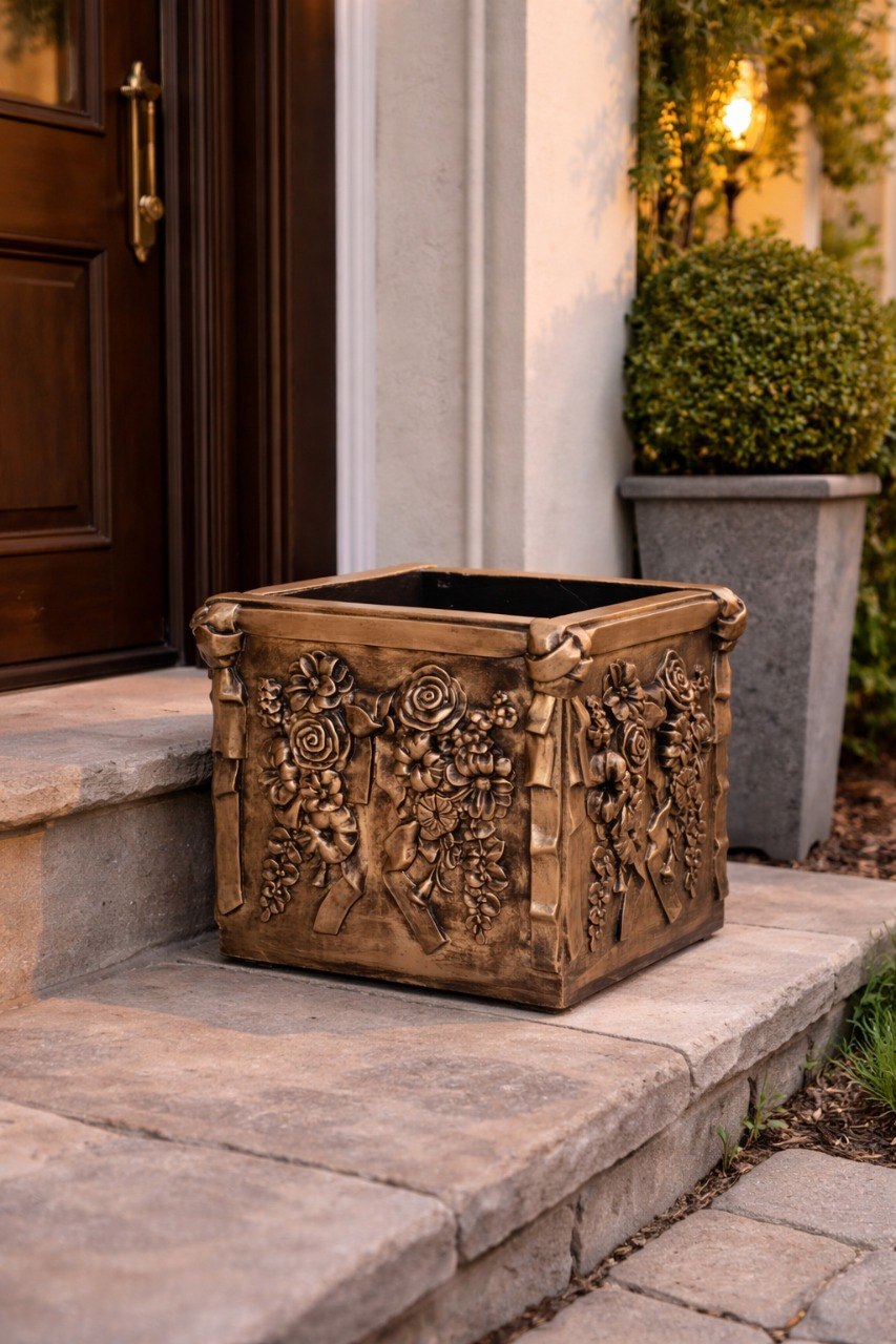 Вазон классической формы малой вместимости из высокопрочного архитектурного бетона. Этот материал предназначен для уличного использования, не боится жары и перепадов температуры. Вазоны не нужно закреплять для усиления устойчивости, так как они прочные и тяжёлые. Возможно исполнение в различных цветах — белый, золотой, бронзовый. Прокраска в массе. Имеется дренажное отверстие для вывода влаги.