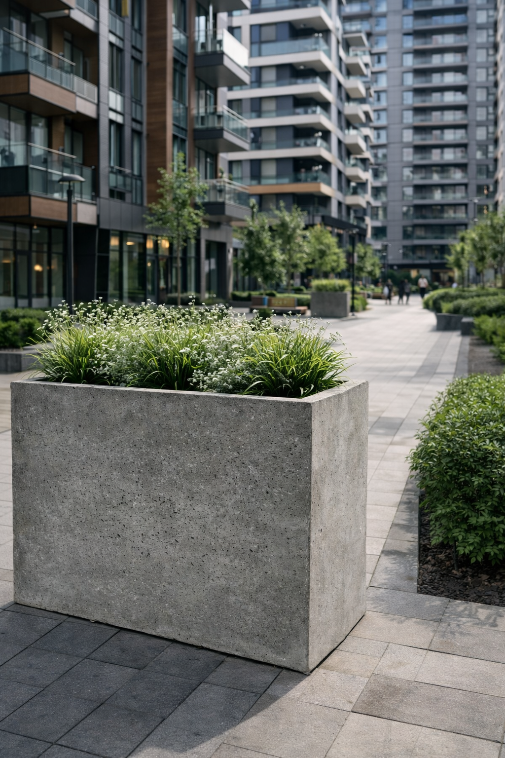 Кашпо визуально зонирует территорию, формирует ритм в композиции и подчёркивает архитектуру объекта. Оптимально подходит для использования в проектах HoReCa, бизнес-центрах, жилых комплексах и премиальных ландшафтных решениях.