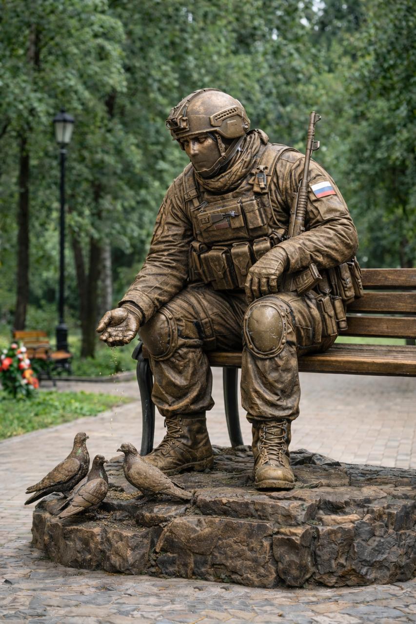 Монументальная скульптура воина, сидящего на скамье и кормящего голубей, — глубокий и трогательный памятник СВО, раскрывающий образ защитника с человеческой стороны. Этот монумент передаёт тишину, паузу между событиями и ценность мира, создавая сильный эмоциональный отклик у зрителя.