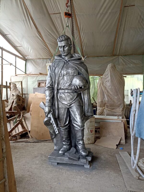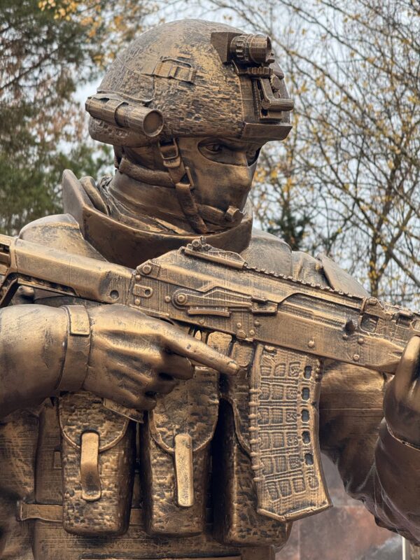 Скульптура солдата в полный рост – это монументальная композиция, созданная в честь бойцов, участвующих в военных действиях. Статуя выполнена с высокой детализацией, передающей реалистичный облик современного военнослужащего. Бронежилет, униформа, экипировка и оружие проработаны до мельчайших элементов, подчёркивая дух воинской доблести и патриотизма.