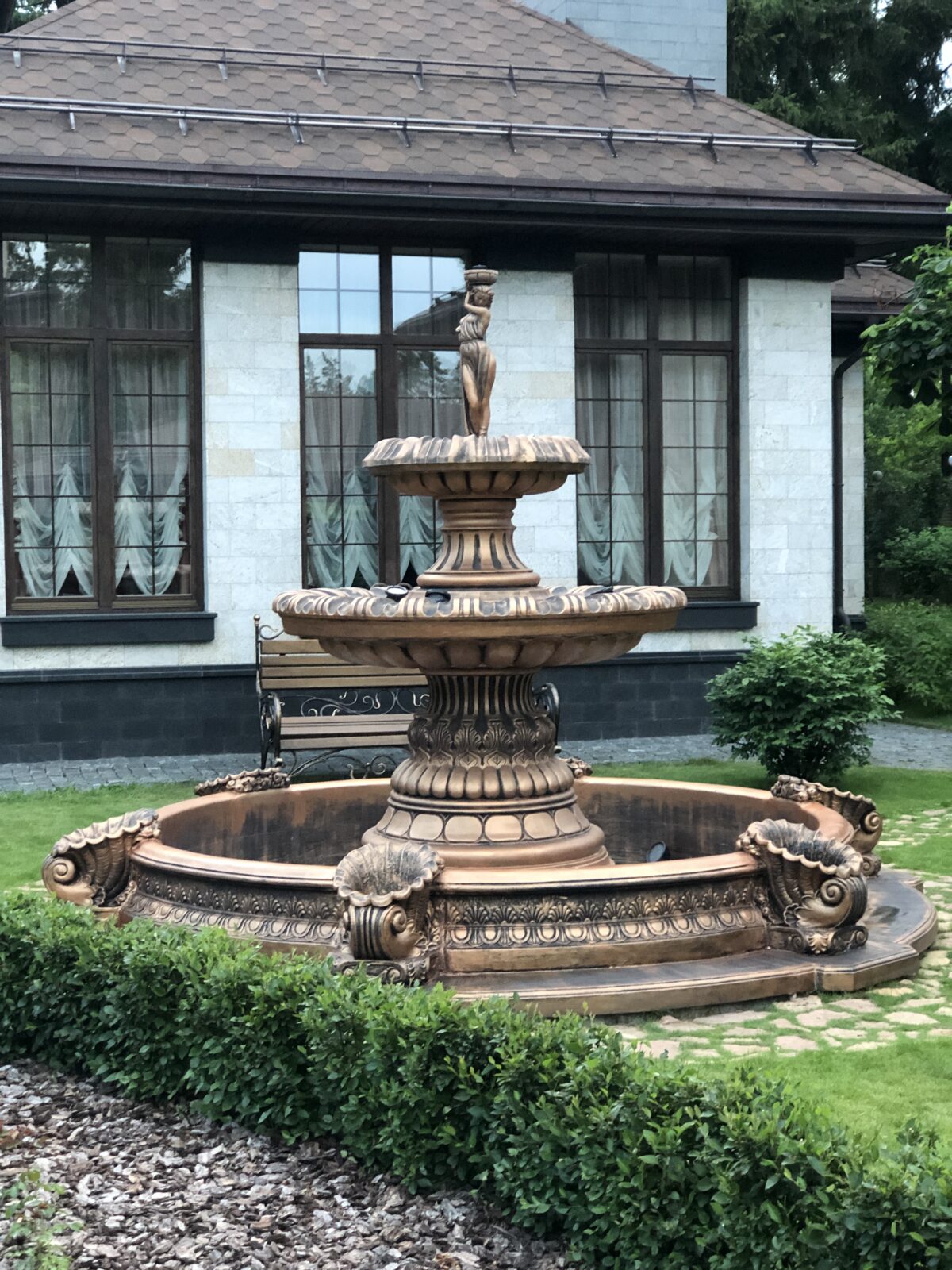Фонтан диаметром 4 метра стал новым сердцем двора. Он идеально вписался в архитектуру дома и подчеркнул линию парадного входа. Днём бронзовая отделка сияет тёплым оттенком под солнцем, а вечером подсветка превращает воду в живой свет, создавая атмосферу уюта и торжественности одновременно.