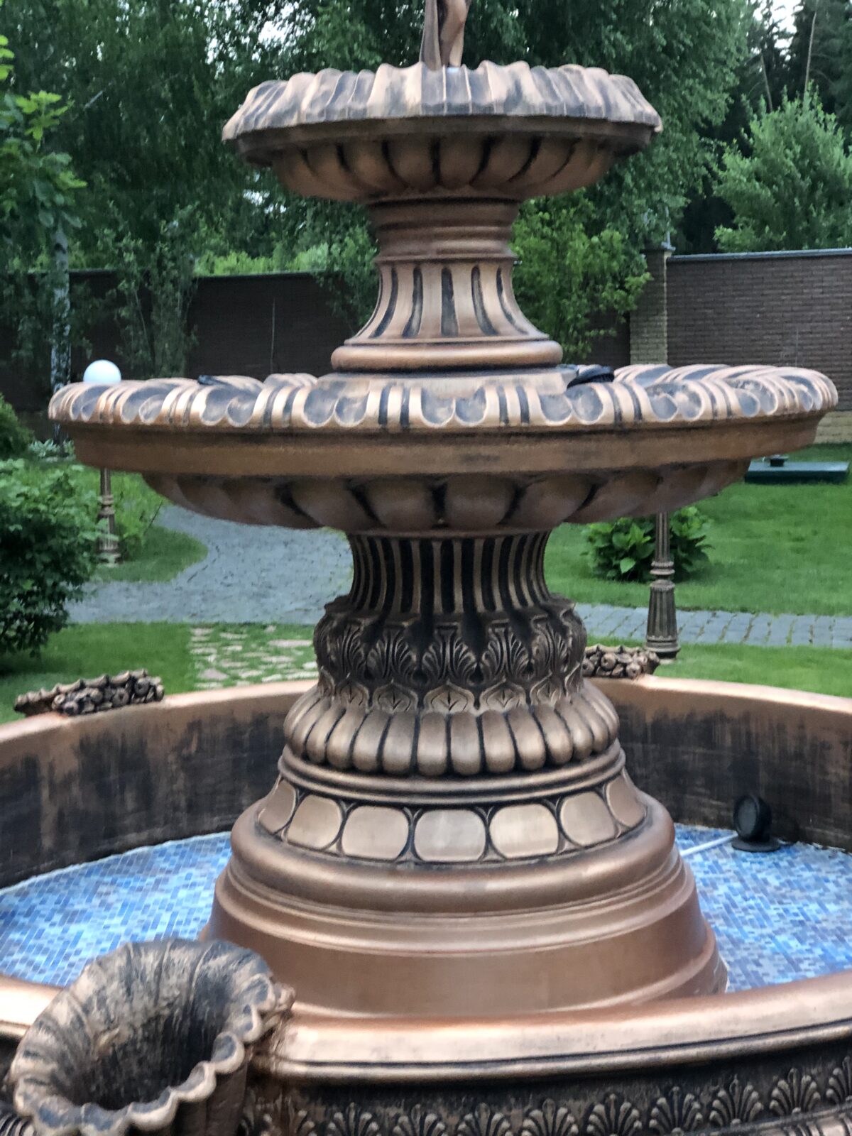 Фонтан выполнен из армированного архитектурного бетона, устойчивого к перепадам температур. Покрытие — античная бронза с мягкой патиной, нанесённой вручную. Благодаря этому фонтан выглядит как произведение искусства, а не просто элемент декора.
