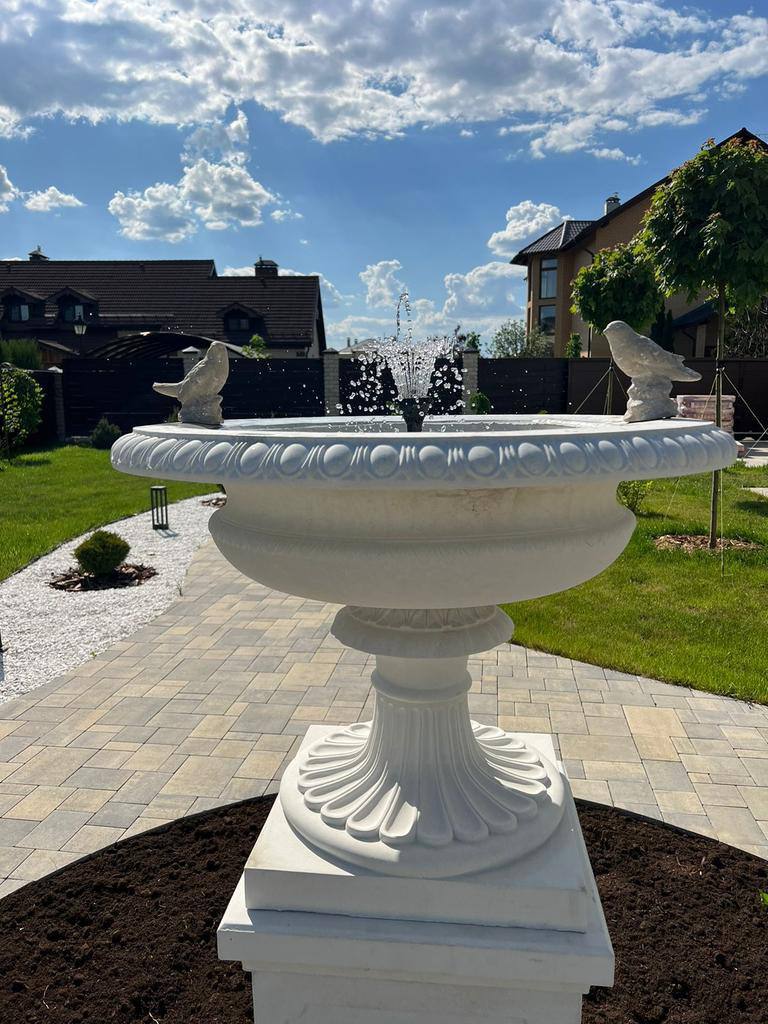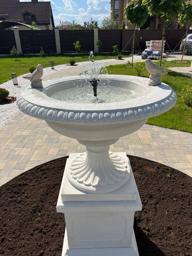 Стандартные фонтанчики часто не подходили ни по стилю, ни по размеру. Поэтому мы предложили нестандартное решение — использовать в качестве чаши классический вазон «Сицилия» и установить его на аккуратный постамент.