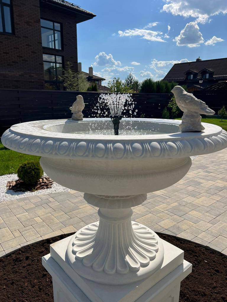 Это не просто декоративный элемент — благодаря неглубокой чаше и бортику, птицы с удовольствием прилетают пить воду и купаться.