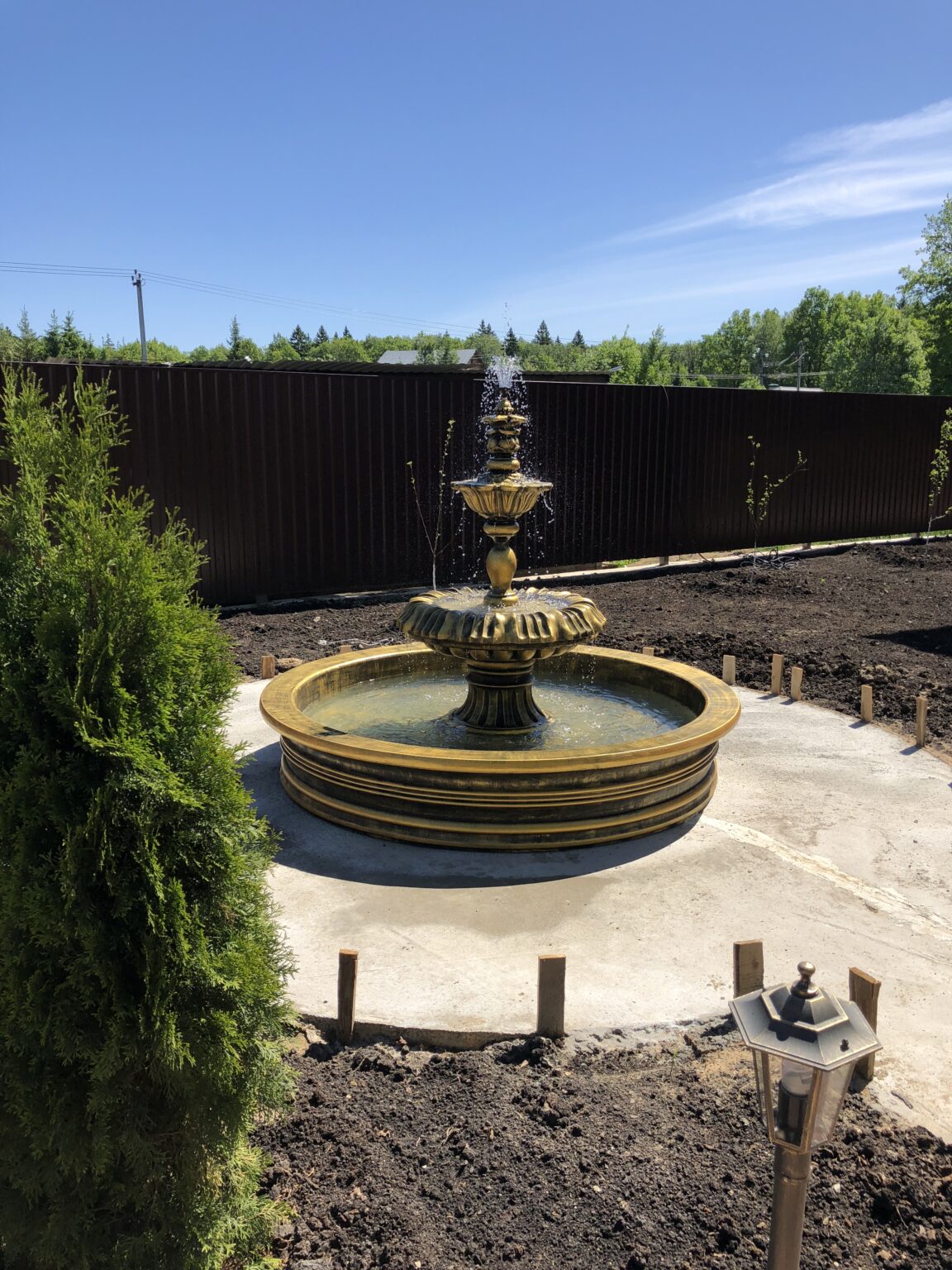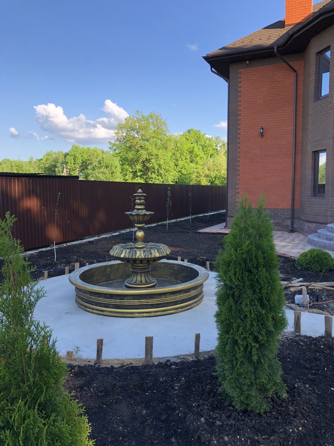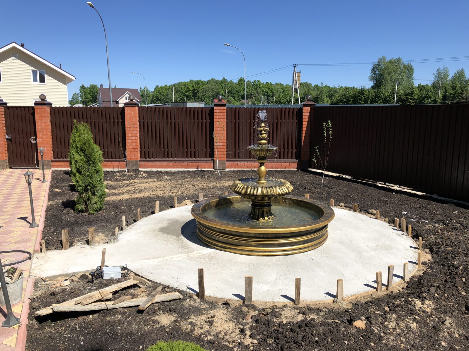 На участке клиента фонтан разместили по центру круглой бетонной площадки, что подчёркивает его архитектурную значимость. Вокруг предусмотрена зона озеленения — туи, кустарники, декоративные растения, тропинки.