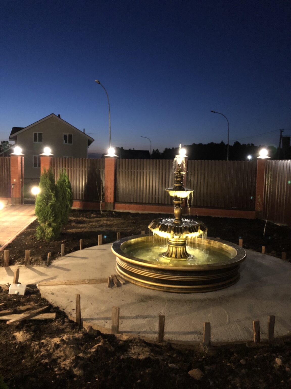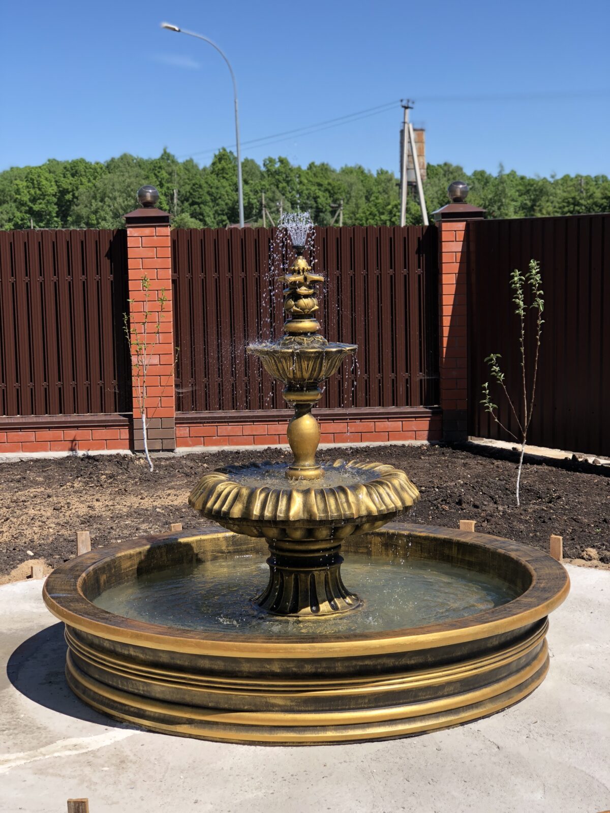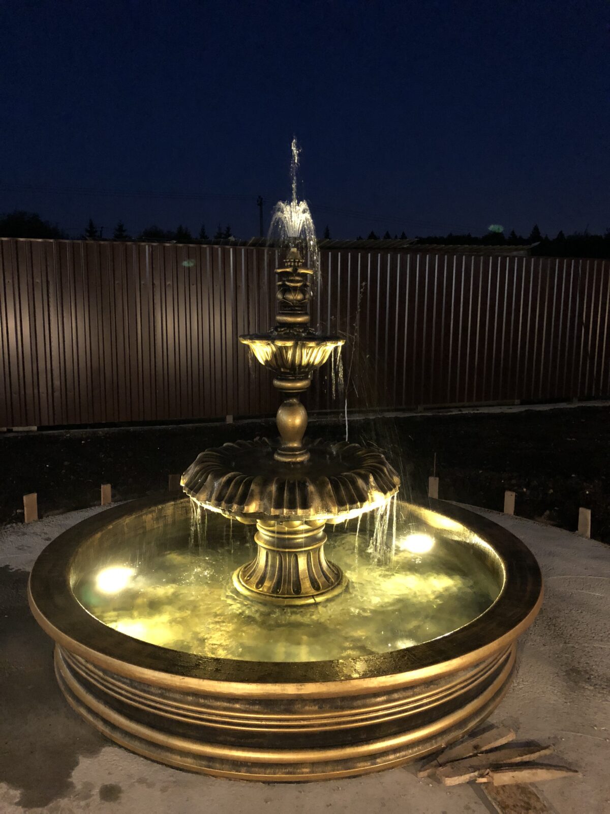 Установленный на участке клиента королевский фонтан в золотом цвете стал центральным элементом всей входной зоны, создавая образ роскоши, статуса и продуманного ландшафтного дизайна. Такой фонтан — не просто декоративный объект, а полноценная архитектурная доминанта, которая меняет атмосферу пространства днём и особенно ночью, когда включается подсветка и вода играет мягкими бликами.