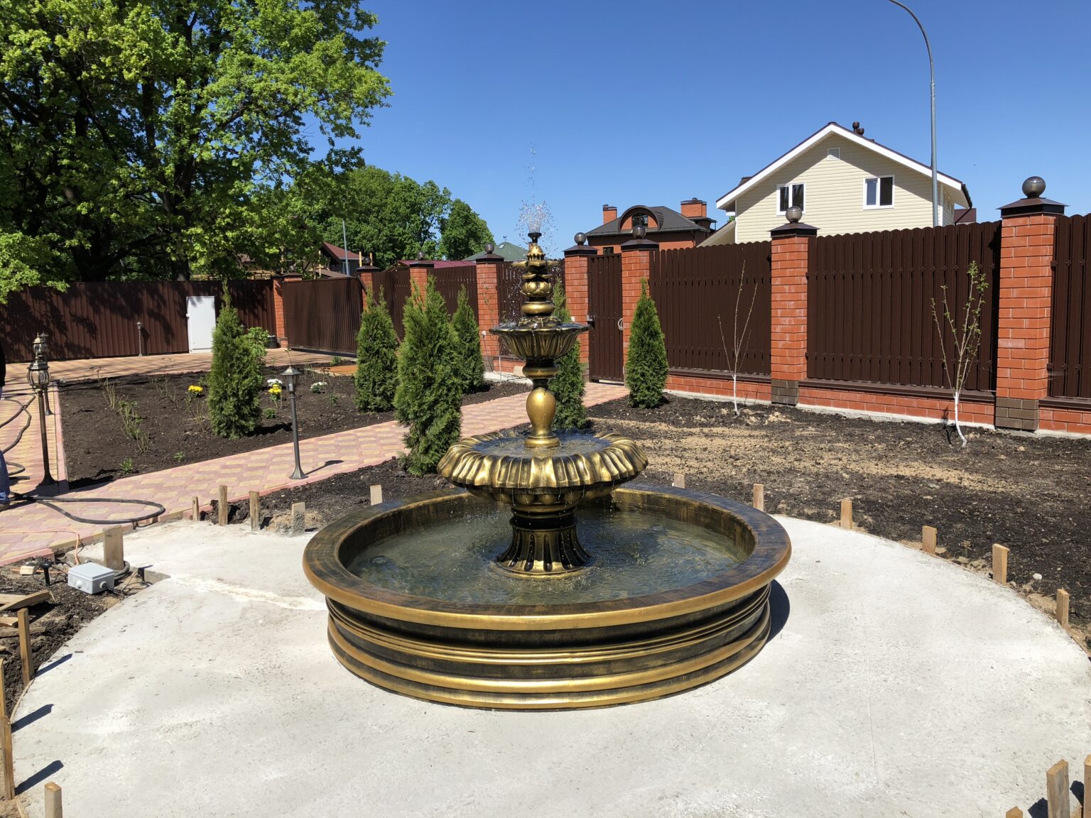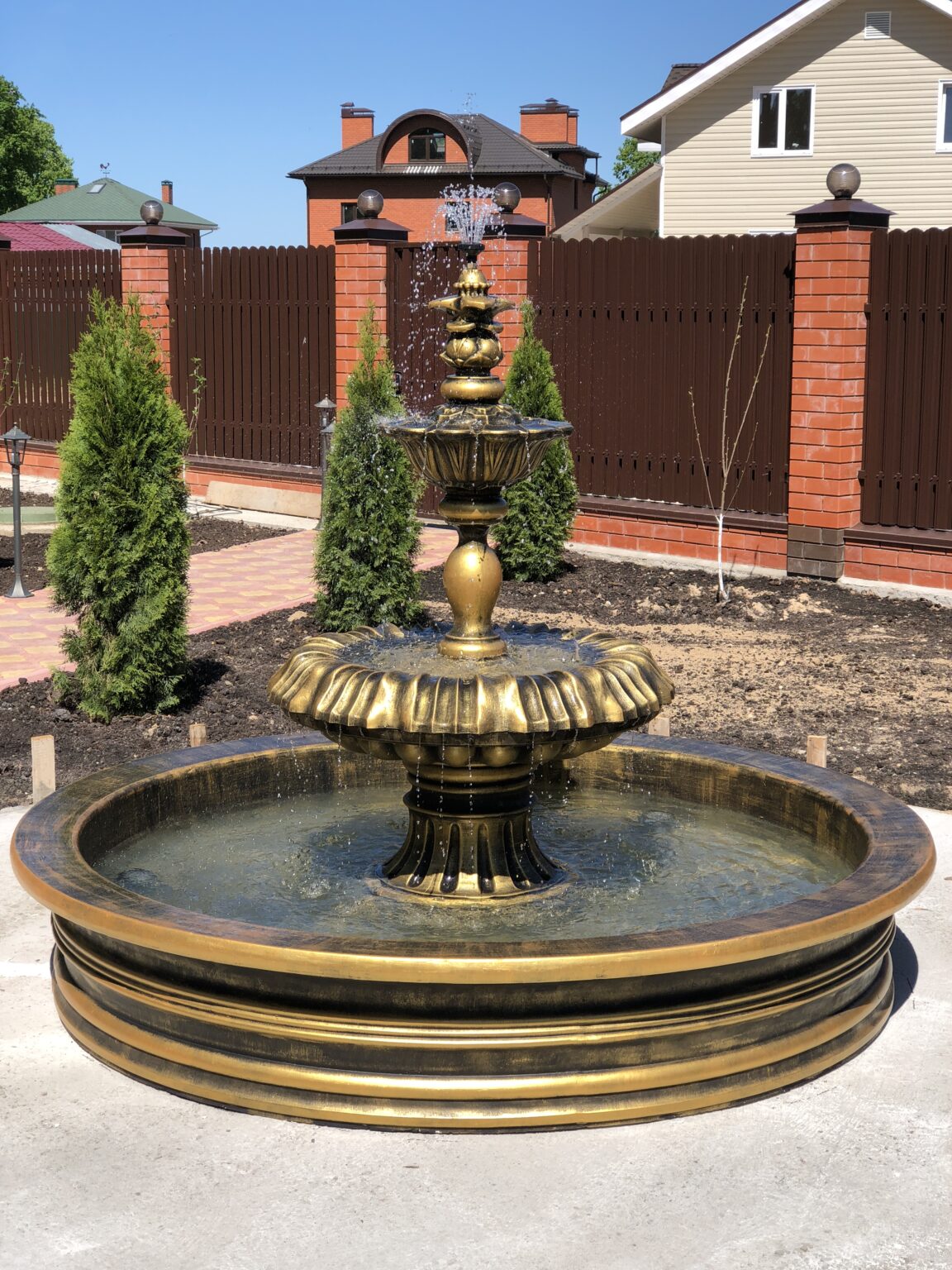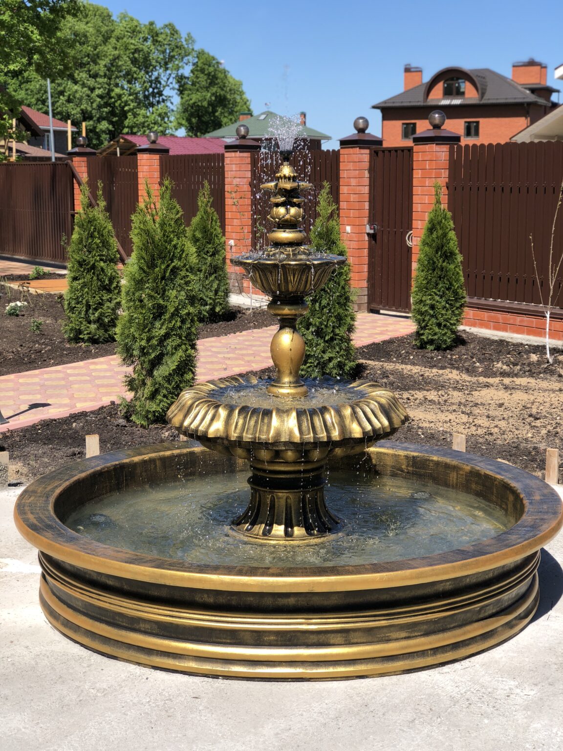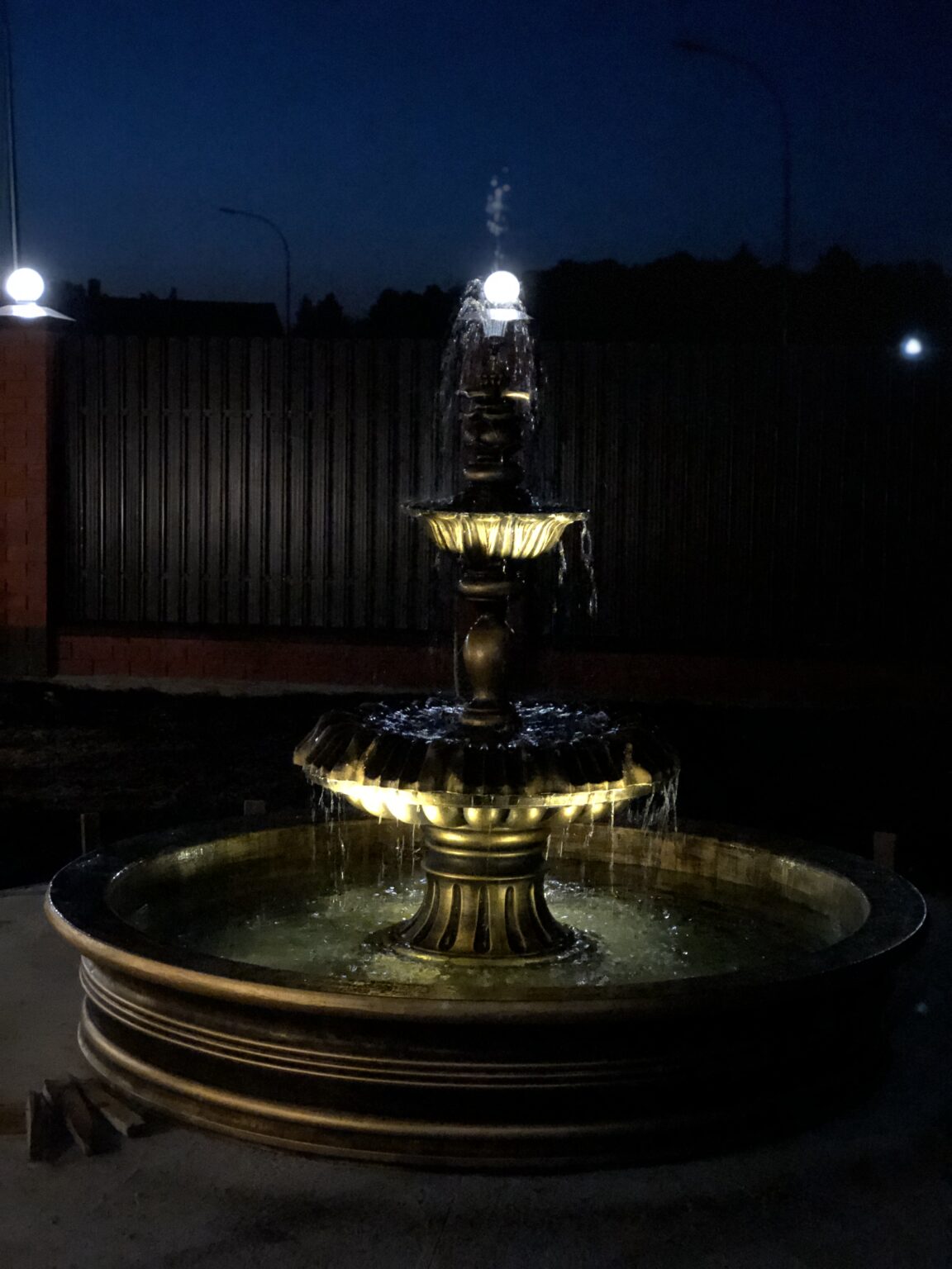 Установленный на участке клиента королевский фонтан в золотом цвете стал центральным элементом всей входной зоны, создавая образ роскоши, статуса и продуманного ландшафтного дизайна. Такой фонтан — не просто декоративный объект, а полноценная архитектурная доминанта, которая меняет атмосферу пространства днём и особенно ночью, когда включается подсветка и вода играет мягкими бликами.