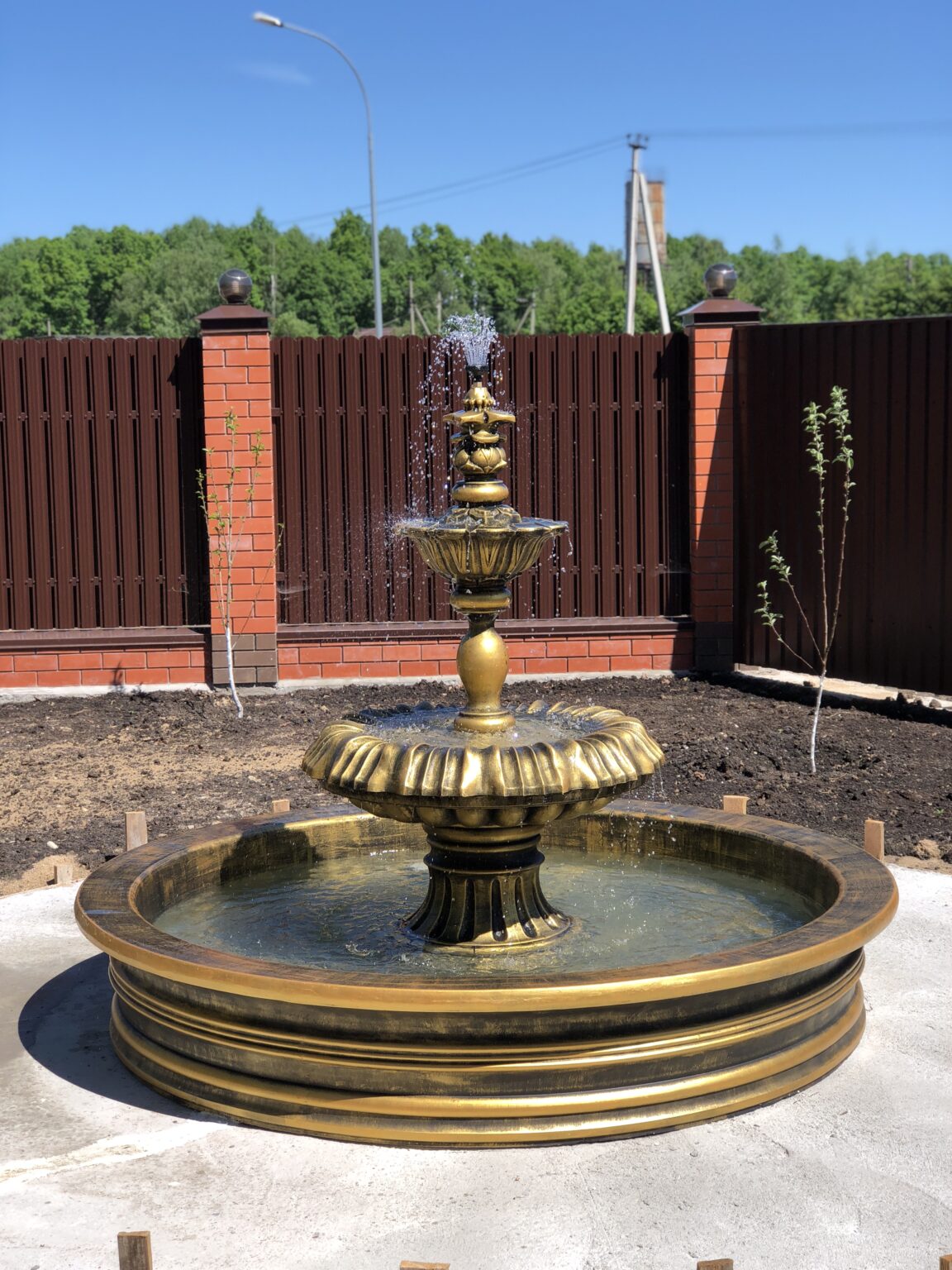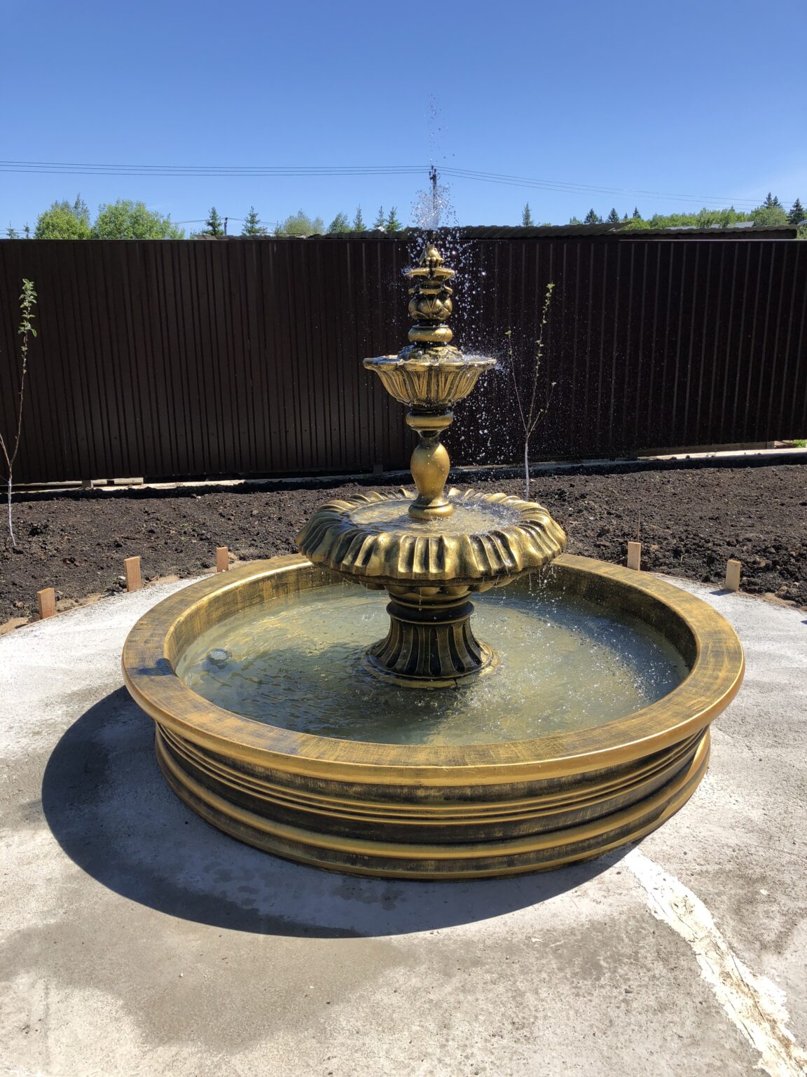 Все элементы отлиты в высокоточной форме и обработаны вручную, что обеспечивает глубину рельефа и идеальную симметрию. Днём фонтан выглядит как бронзовый архитектурный объект, отражающий солнечный свет. На открытом участке золотой оттенок смотрится особенно выигрышно на фоне кирпичных и деревянных ограждений.