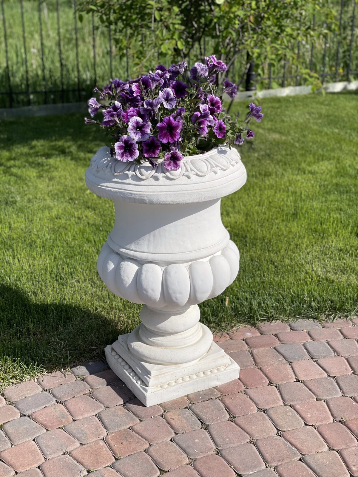 Чтобы композиция звучала целостно, мы предложили дополнить ее вазонами “Римская чаша” для растительных акцентов и сезонных композиций и садовыми лавками чтобы красота работала не только визуально, но и функционально.