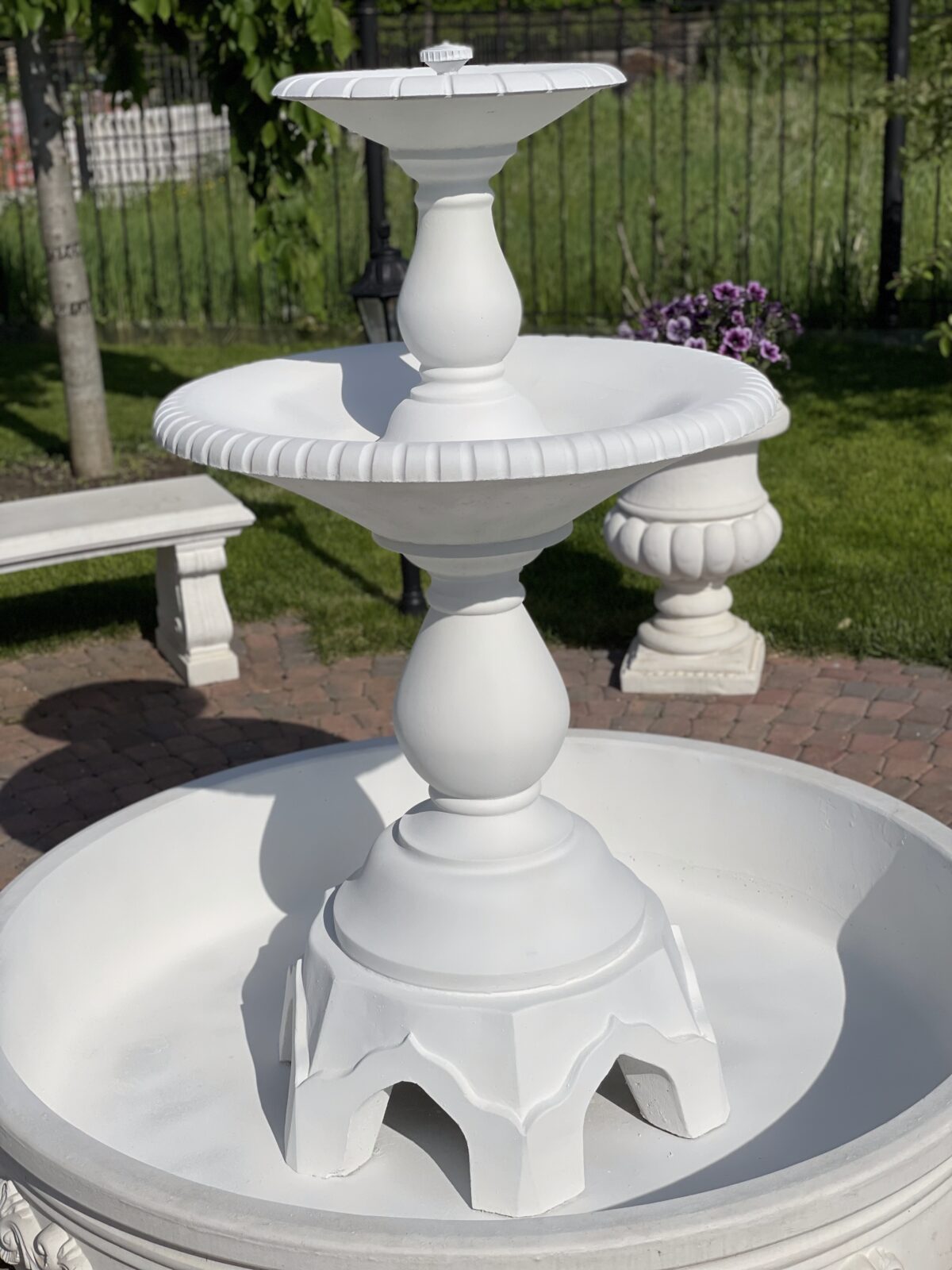 Есть участки, которые созданы не для того, чтобы «показать». Они созданы для жизни: для утреннего кофе, вечерних разговоров, тишины после шумного дня. Именно таким стал сад нашего клиента, где в центре появилась гармоничная композиция из фонтана «Флоренция», римской чаши и садовых лавок.