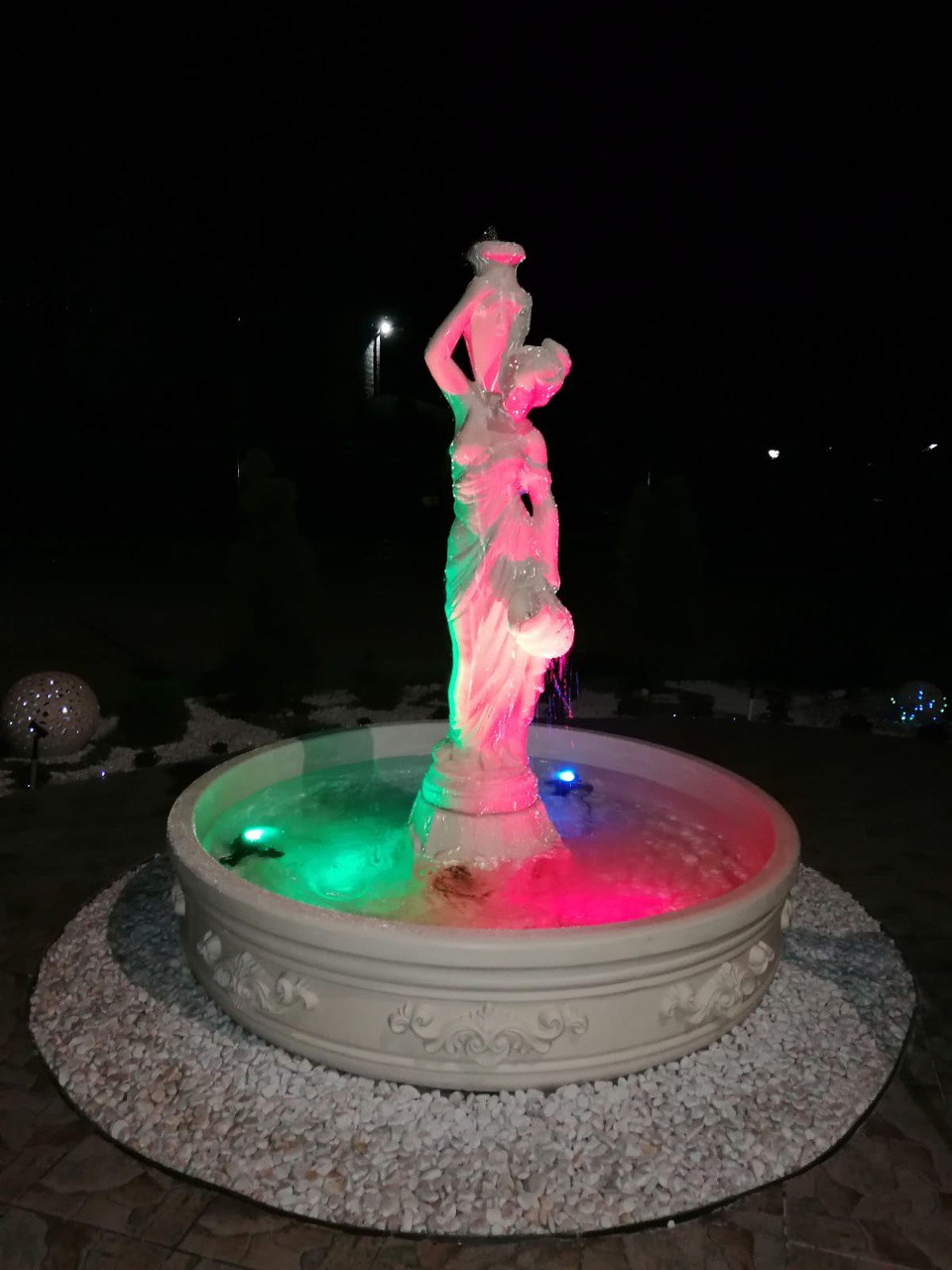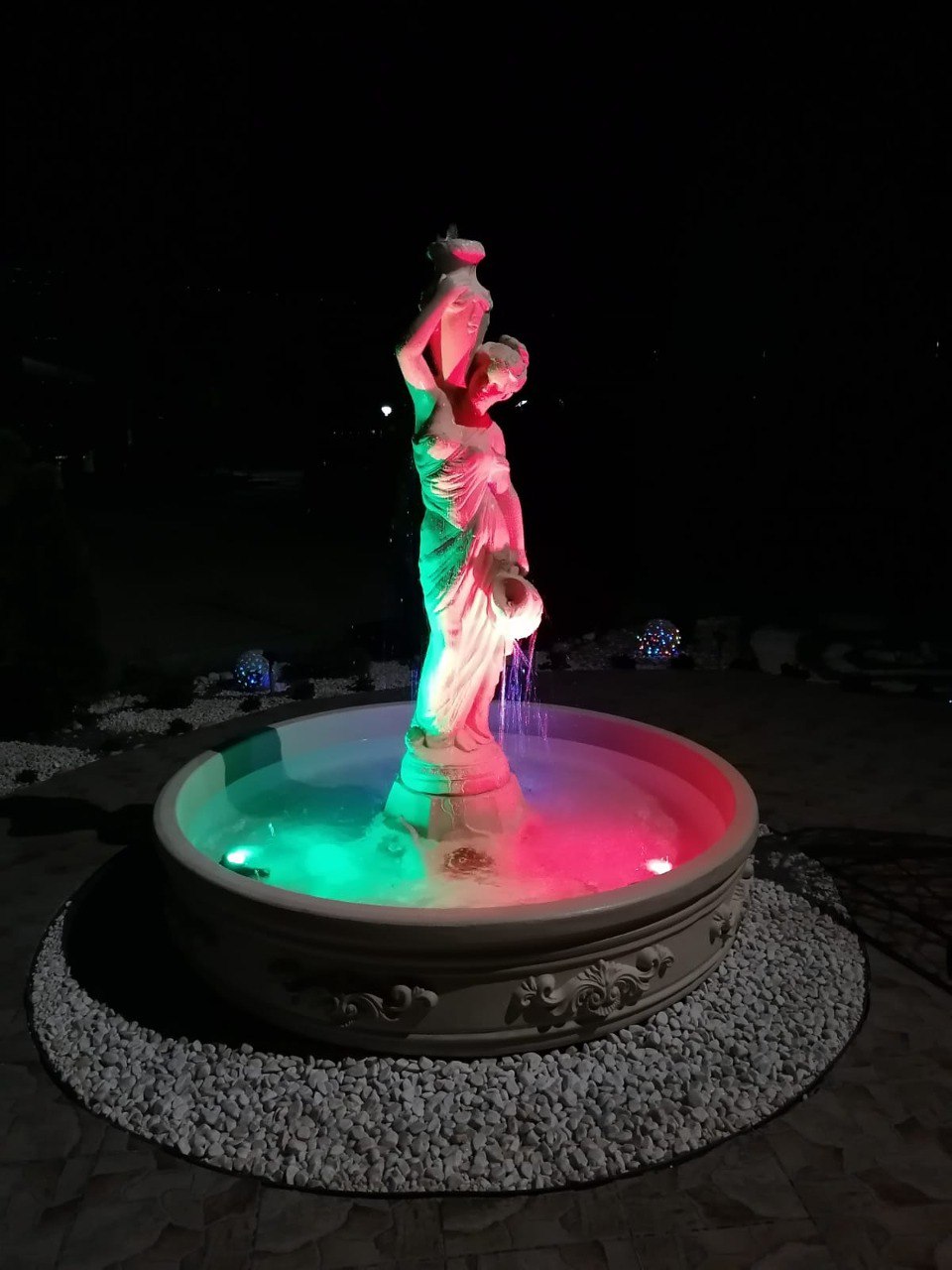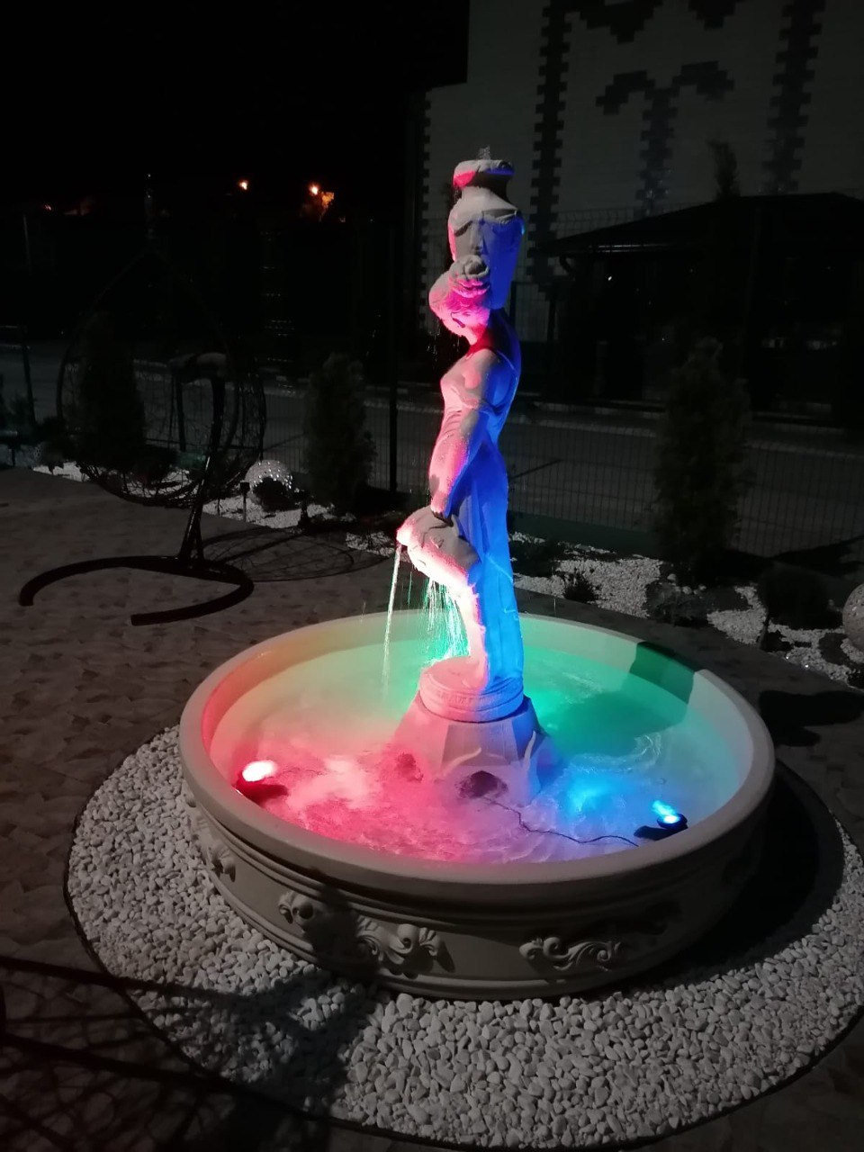 Мягкий свет подчёркивает линии скульптуры, и кажется, что фигура оживает — как будто девушка действительно несёт воду, ступая из света в тень. Подсветка делает фонтан не просто элементом сада, а ночной инсталляцией — тихой, живой, завораживающей.