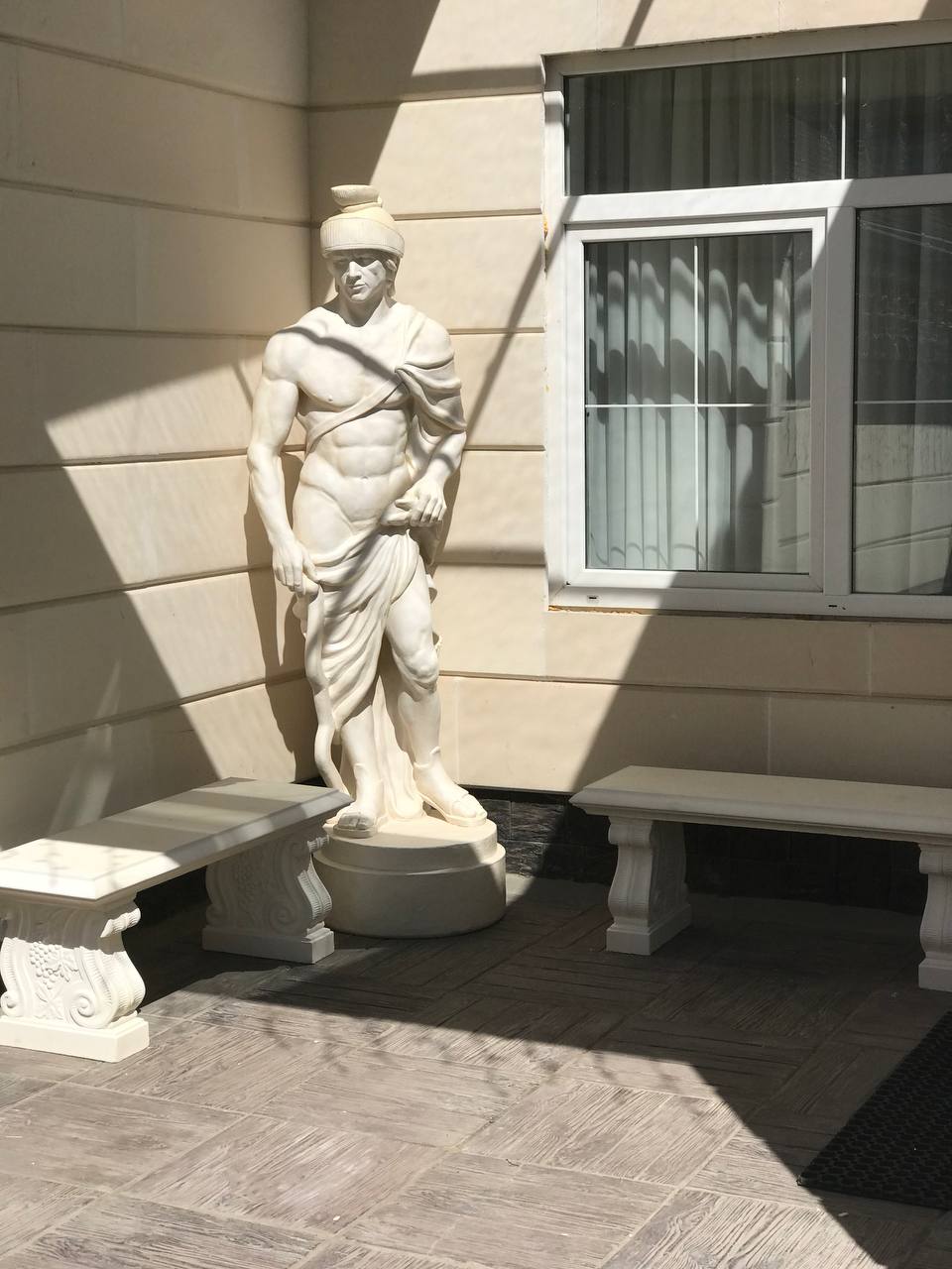 Скульптура установлена в дворовой нише, которая работает как природная сцена. Солнечные лучи падают на поверхность так, что рельеф мышц и складки ткани выглядят живыми.