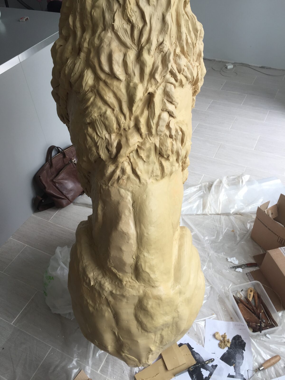 3.Создание деталей. Пласты раскатывались вручную, прикладывались к основе, выравнивались, затем прорабатывались черты морды, гривы, лап, мышц.