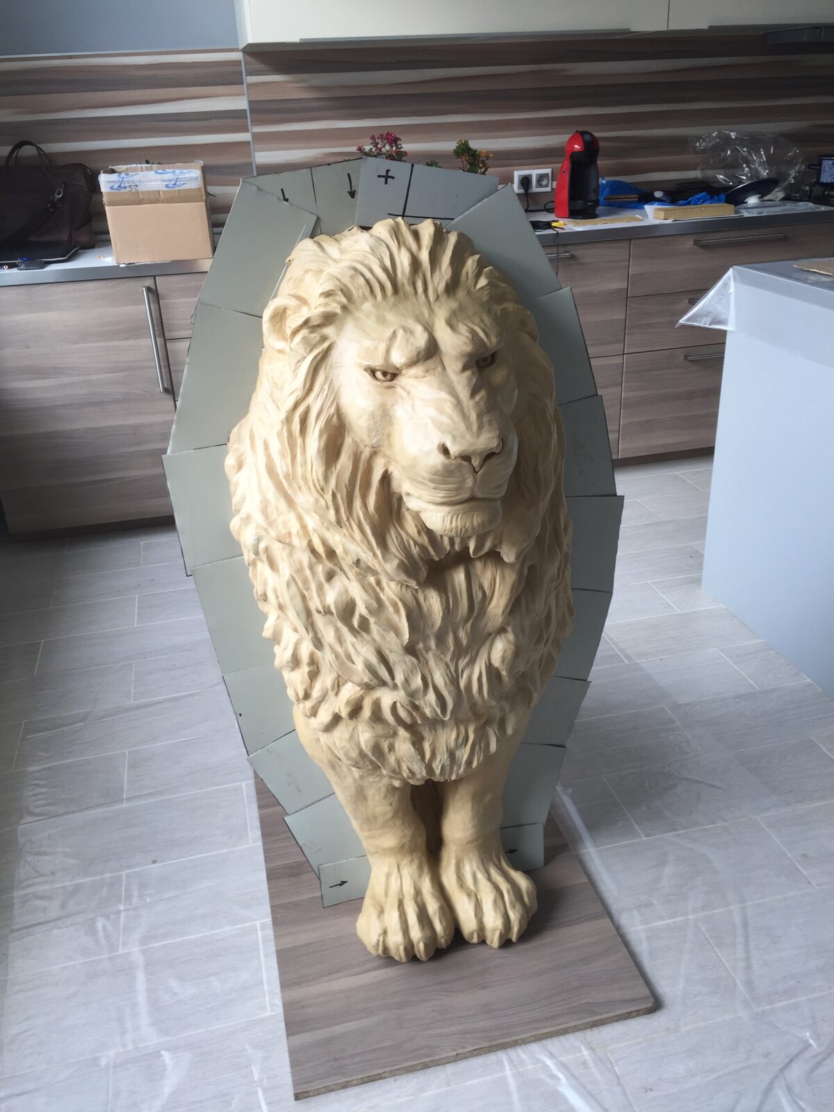 1.Грубая формовка пенопласта. Блок был вручную вырезан до формы будущего льва — убрано всё лишнее, создан условный каркас.