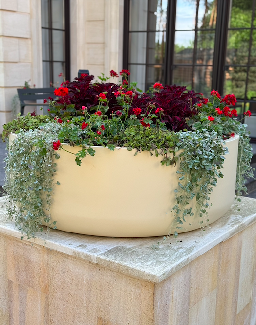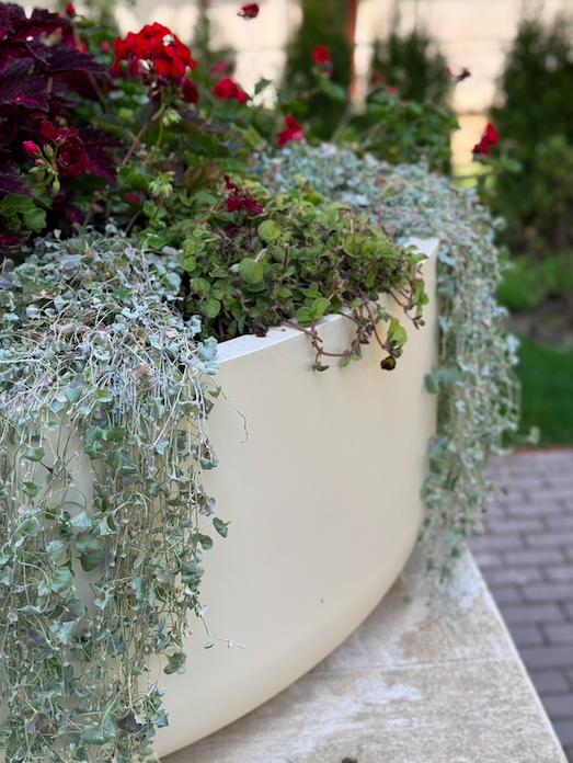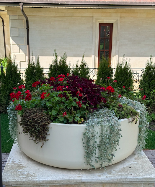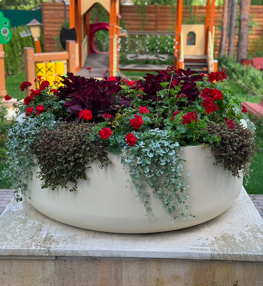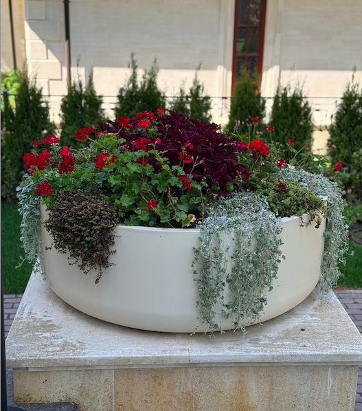 Современный ландшафтный дизайн всё чаще опирается не только на растения, но и на хорошо продуманные декоративные элементы. Один из таких элементов — кашпо “Дубай” из прочного композитного материала, который стал центром композиции в саду нашего клиента. Его лаконичная форма, матовая текстура и универсальный цвет позволили создать яркий, живой цветник, не перегружая пространство.