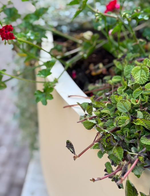 На фото — яркий пример: насыщенные красные оттенки цветов сочетаются с благородной зеленью ампельных растений, мягко спадающих по краям вазона. Такой приём визуально смягчает геометрию изделия и делает композицию по-настоящему живой.