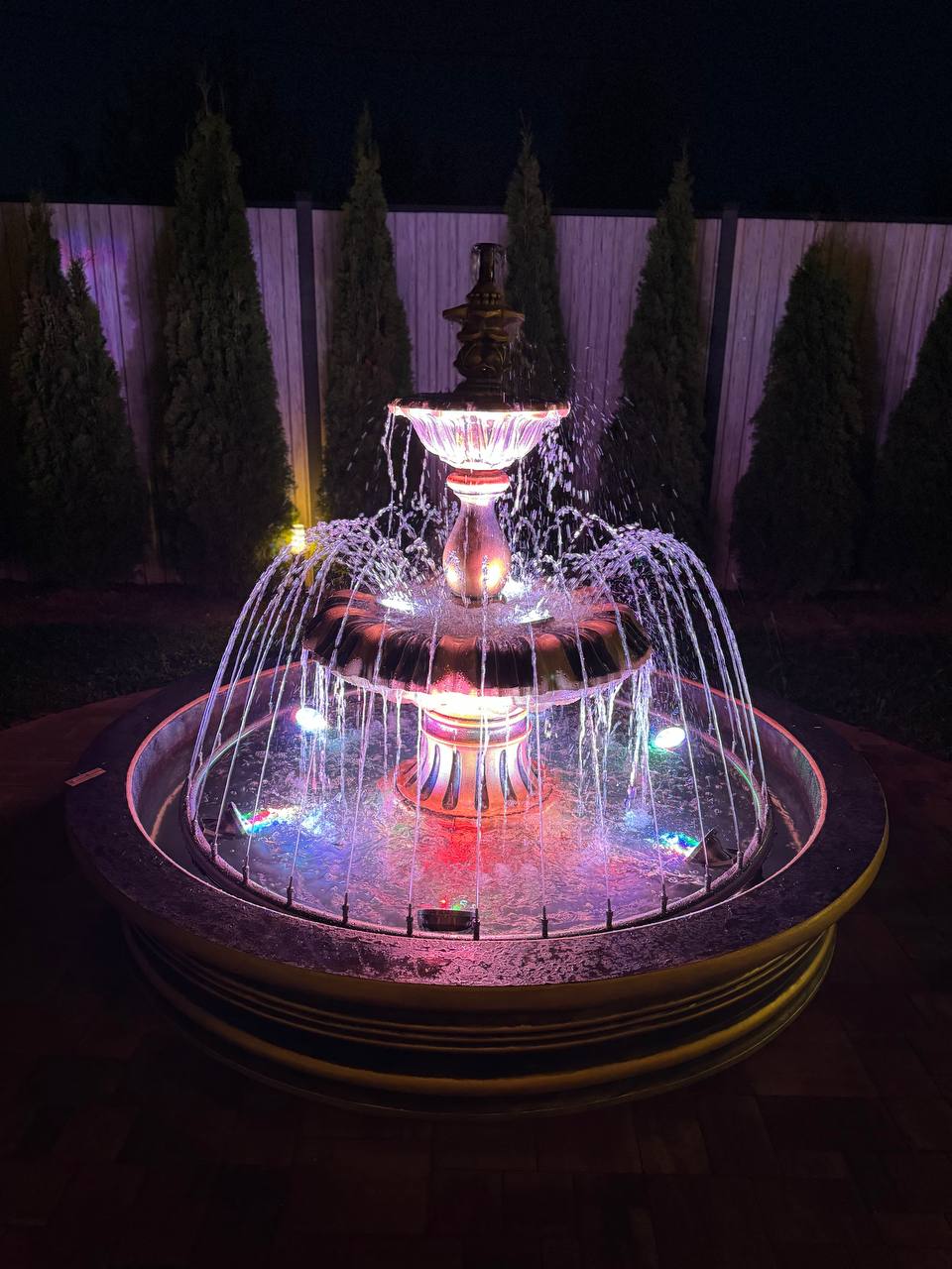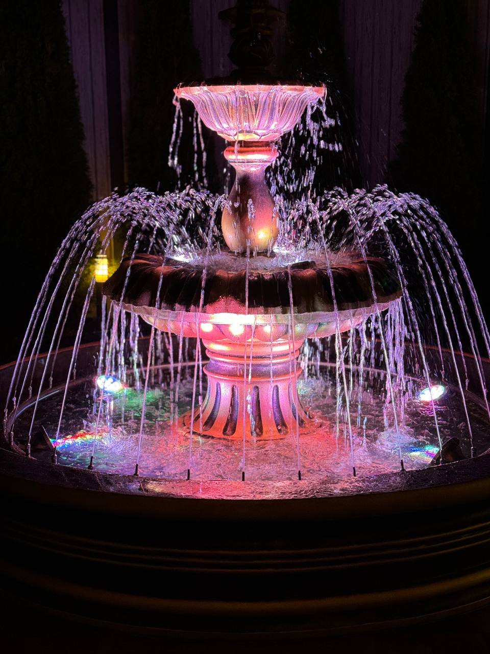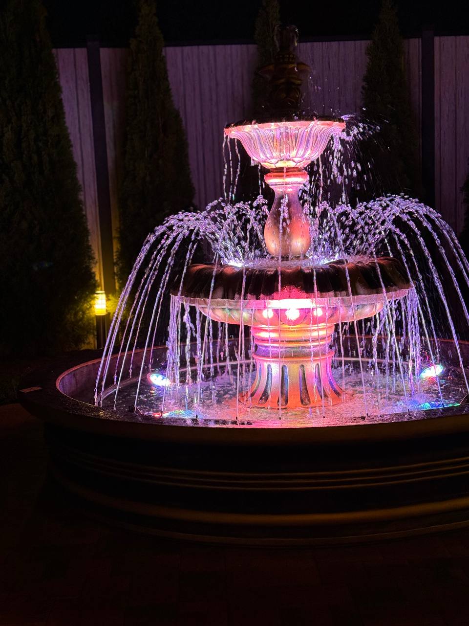 Вечерняя съемка делает акцент на самом важном инструменте современного архитектурного декора — эмоции. Тёплый золотой оттенок создаёт эффект благородства, а подсветка, установленная в сердце чаши, заставляет воду казаться текучим светом. Каждая струя вечером выглядит как тонкая золотая нить, которая не просто падает — рассказывает о статусе места и внимании к деталям.