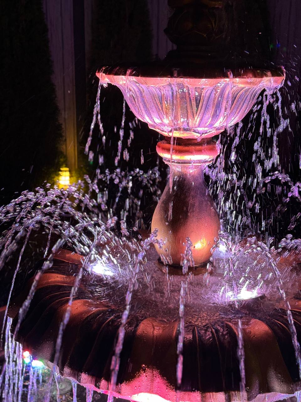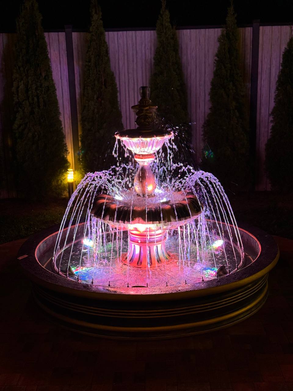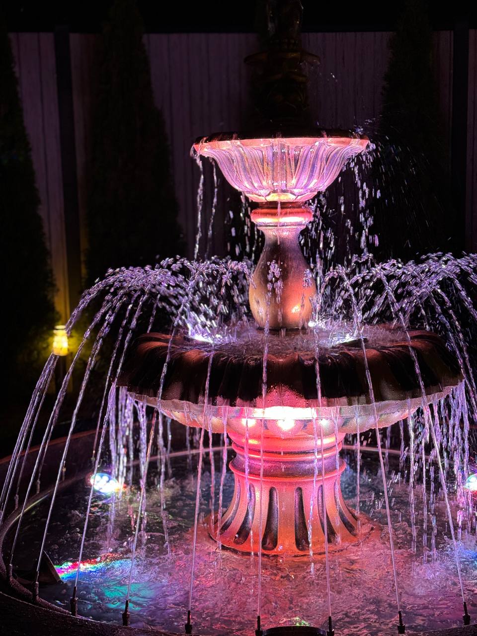 Вечерняя съемка делает акцент на самом важном инструменте современного архитектурного декора — эмоции. Тёплый золотой оттенок создаёт эффект благородства, а подсветка, установленная в сердце чаши, заставляет воду казаться текучим светом. Каждая струя вечером выглядит как тонкая золотая нить, которая не просто падает — рассказывает о статусе места и внимании к деталям.